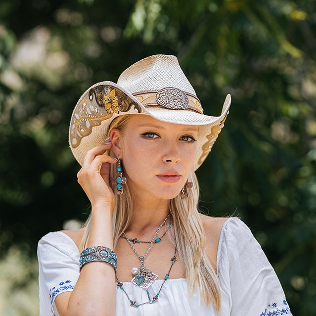 The ABIGAIL hat is the perfect choice for those seeking a stylish, genuine Panama straw hat. The hat features a large floral buckle and a genuine leather band with an attractive floral design. The 4 inch brim is accented with a floral pattern adding a unique flair and the Stampede Collection is sure to turn some heads.