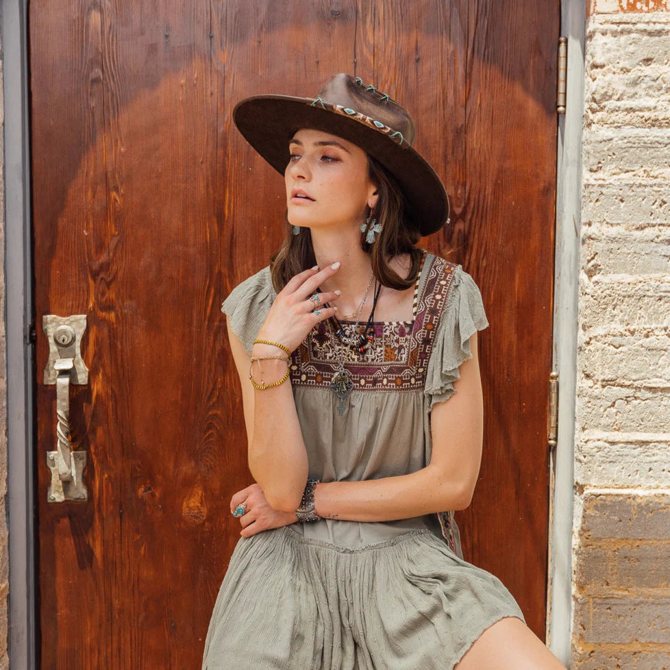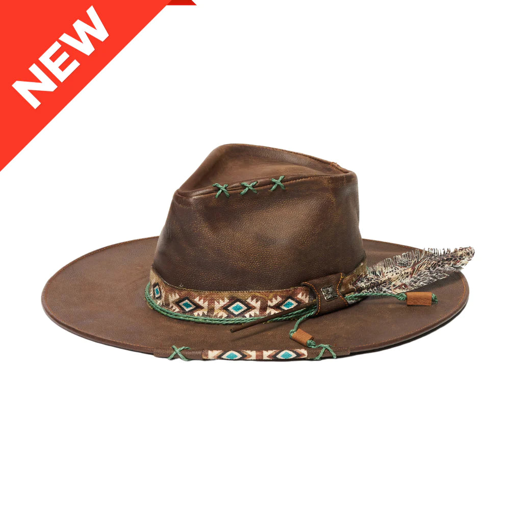 Expertly crafted with genuine leather and adorned with turquoise green accents, the ABILINIE hat in brown offers a sophisticated touch to any outfit. Its wide brim of 3 1/2 inches provides ample sun protection while adding a stylish twist to your look. Elevate your wardrobe with this timeless hat.