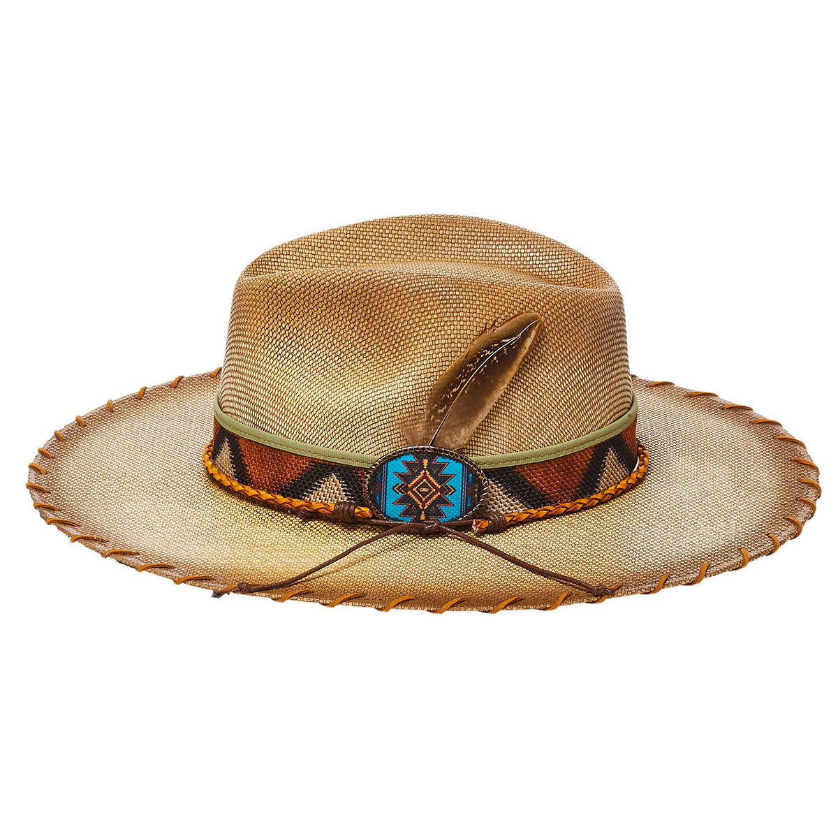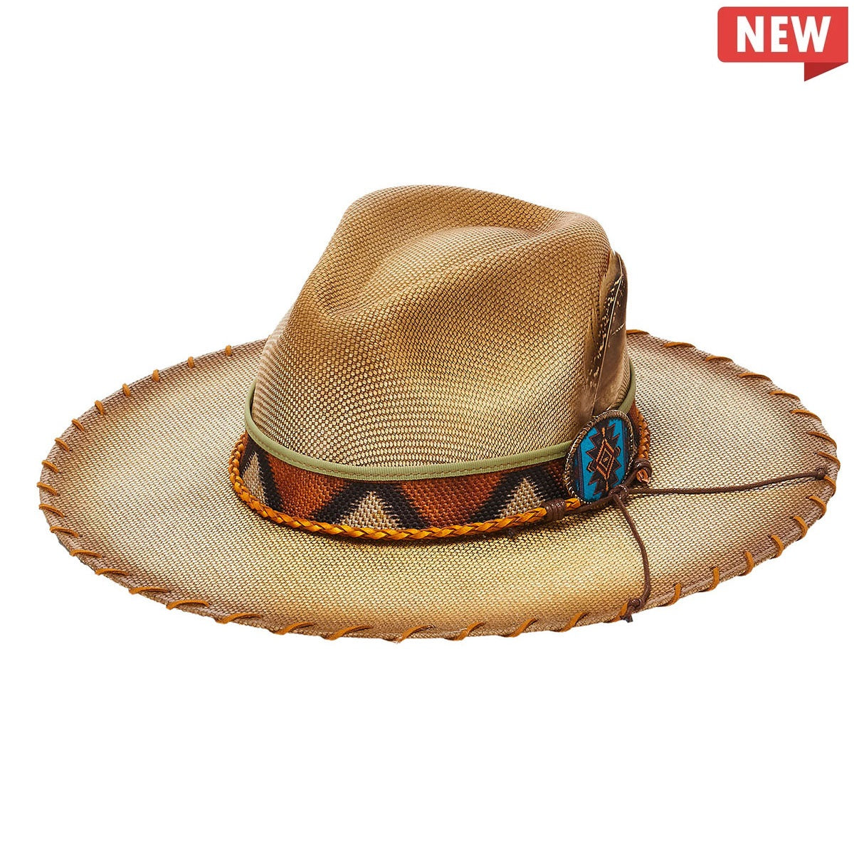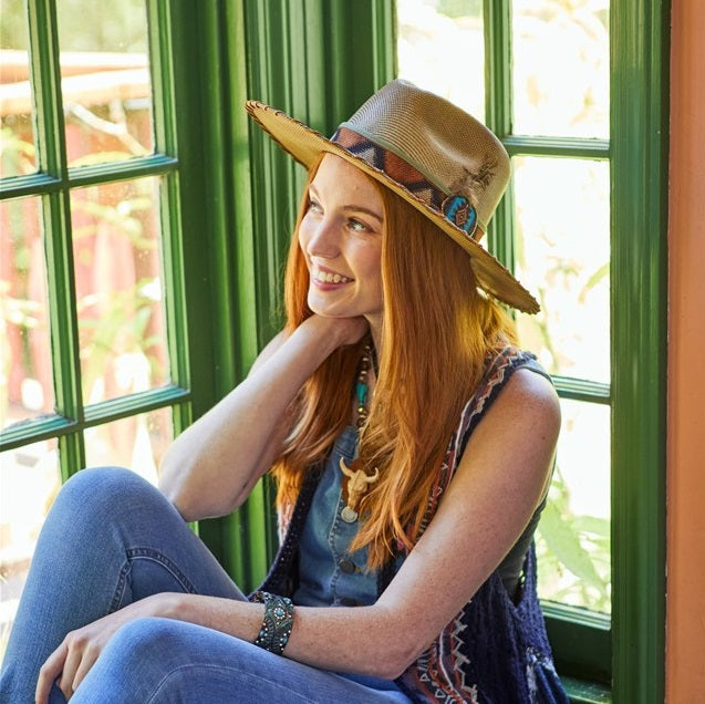 Introducing the ALBUQUERQUE canvas hat. Crafted with premium nylon and featuring a triangular pattern, blue buckle with feather insert and braided chord, this 3.5 inch flat brim hat from the Stampede Collection is both stylish and durable. Perfect for year-round wear.