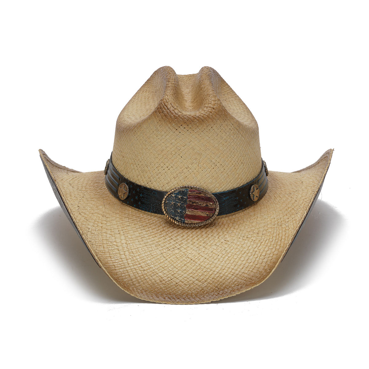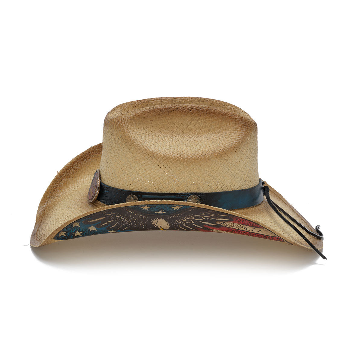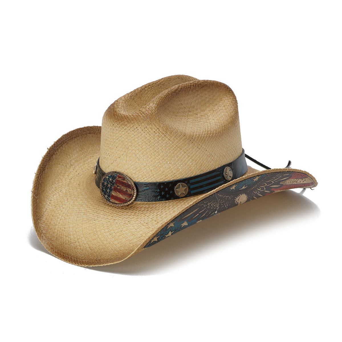 The AMERICAN SPIRIT hat is the perfect way to show patriotism. Made of durable genuine panama straw and featuring a genuine leather band with a hand-painted eagle and American flag, it includes an American flag buckle with large star studs and a 4 inch brim. This distinctive hat is sure to stand out in the Stampede Collection.