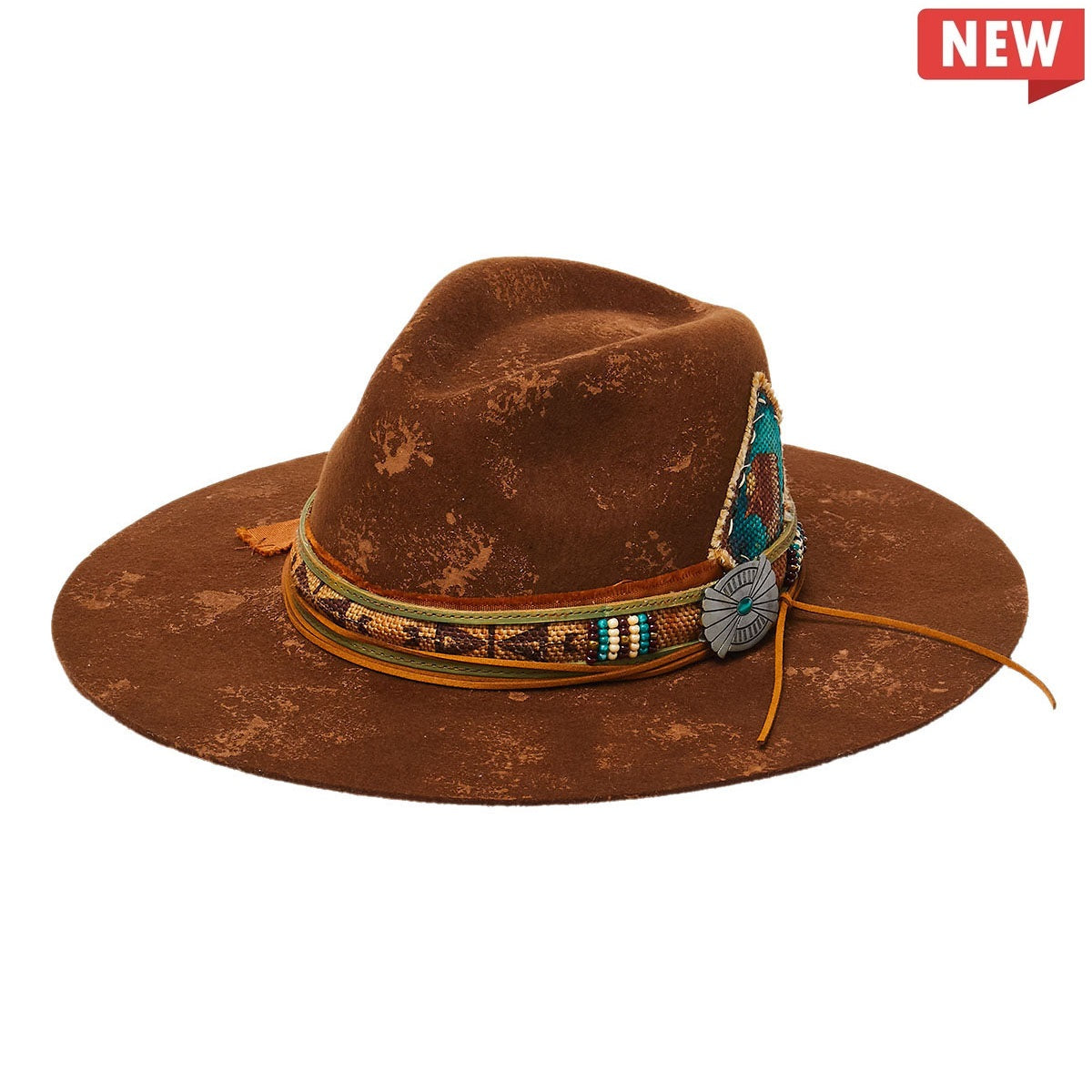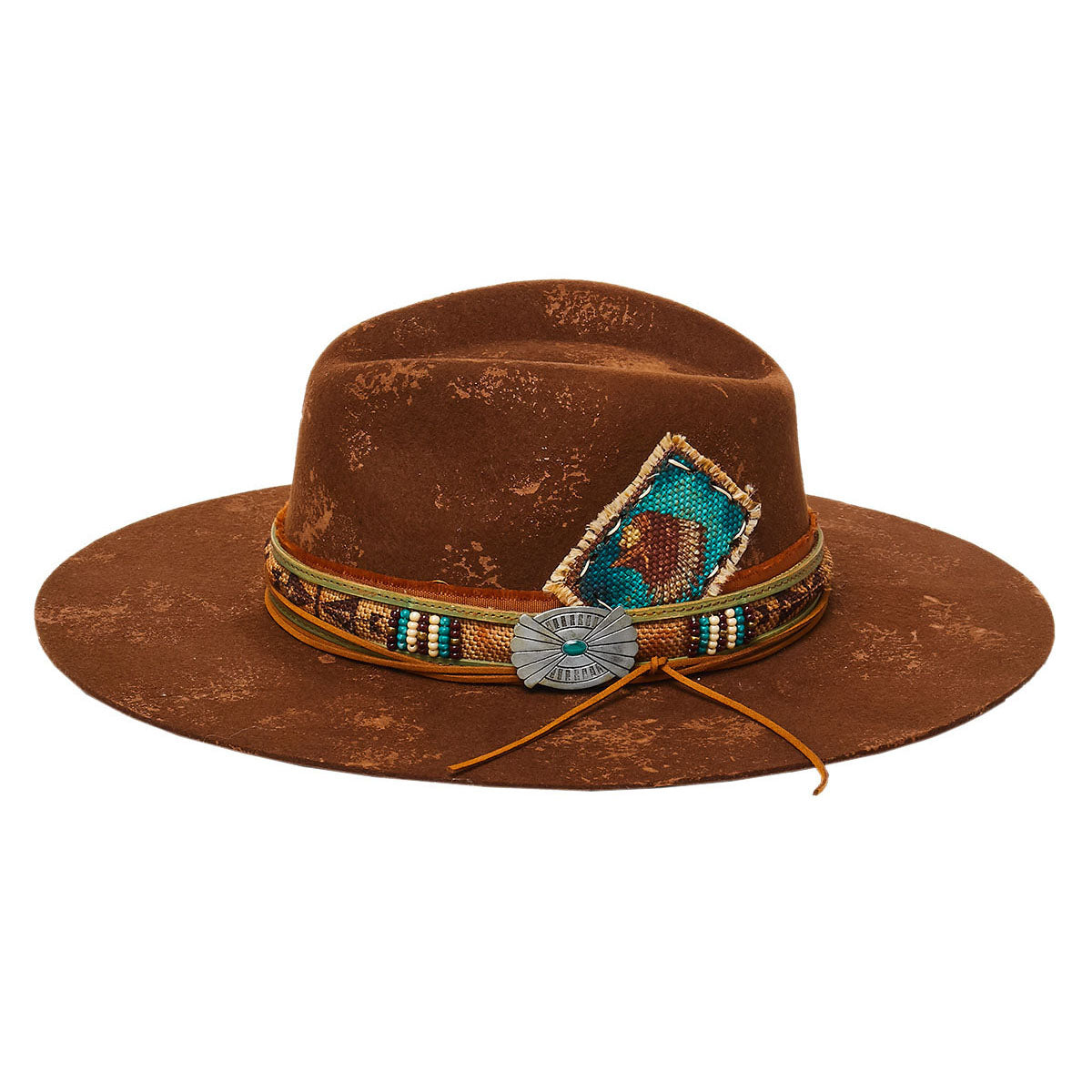 Look your best wearing the Apache Hat, part of the Stampede Collection. Crafted from wool felt, featuring a genuine leather band with intricate design, and adorned with a turquoise stone buckle and Apache patch, this stylish hat is the perfect accessory for any occasion. The 3.5 inch flat brim is complemented by a suede chord, making this a fashionable and durable choice.