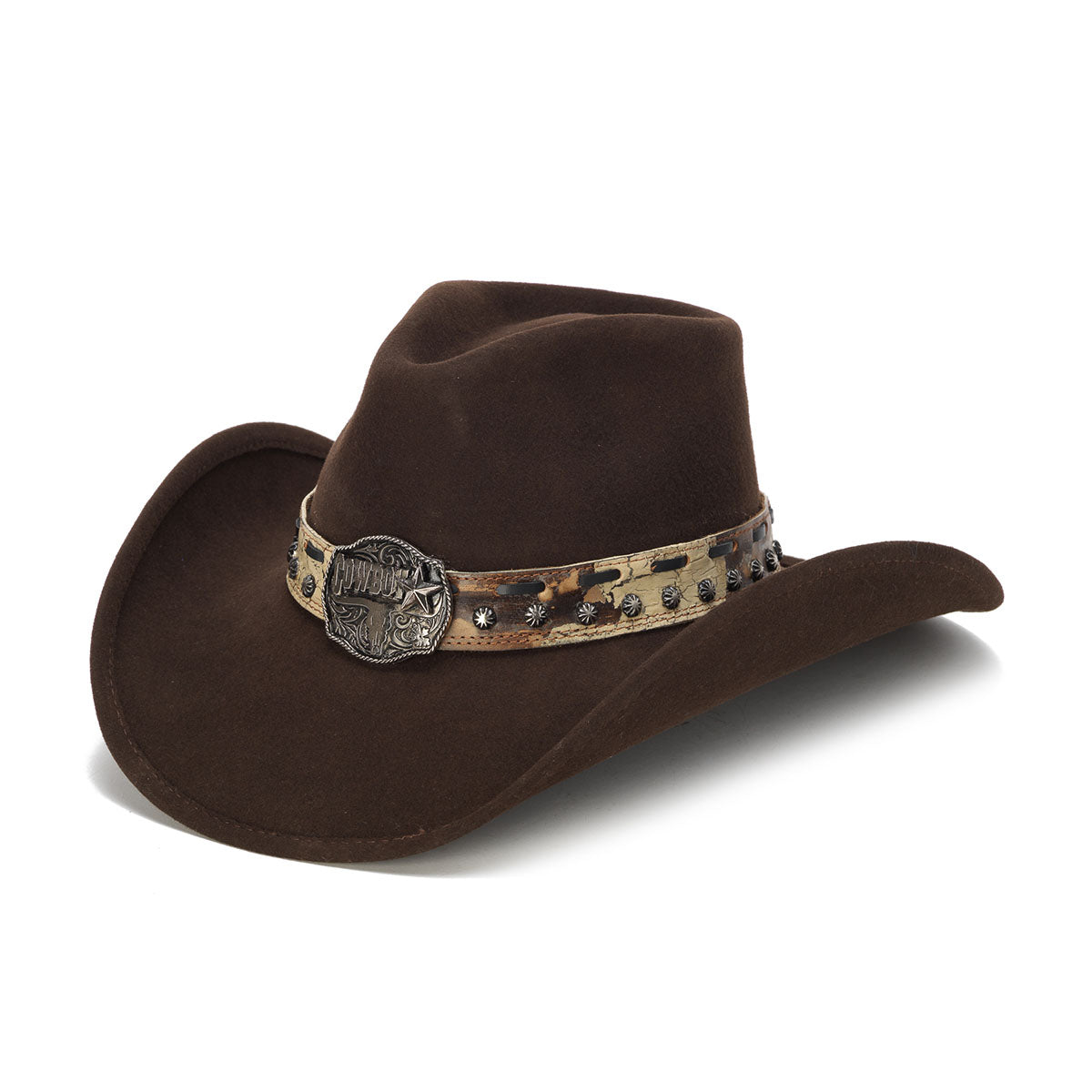 The ARIZONA Hat is designed to provide you with a classic cowboy look. Crafted from wool felt and genuine leather, it features a unique snakeskin pattern and mini studs. The longhorn and star buckle completes the classic aesthetic, with a 4 inch brim to protect you from the sun. No matter the occasion, the ARIZONA Hat from the Stampede Collection gives you a timeless style.