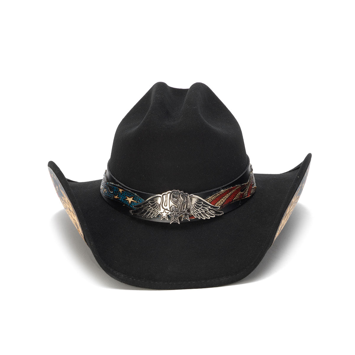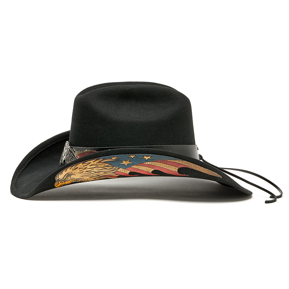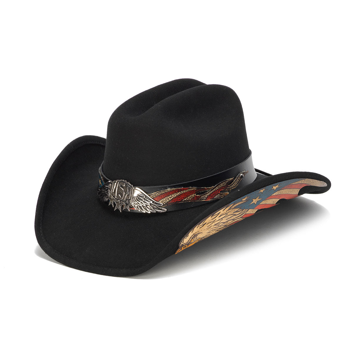 The BILLY hat is a stylish addition to any wardrobe. Crafted with wool felt and genuine leather banding, it features an American flag with flames, USA with wings buckle, and a leather eagle design under the curved brim. With a 4 1/2 inch brim, this piece is part of the Stampede collection, perfect for any outdoor excursion.