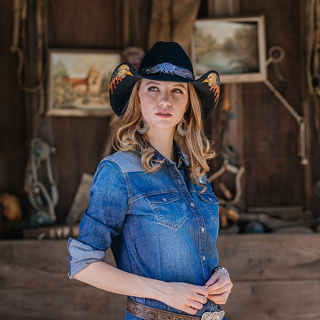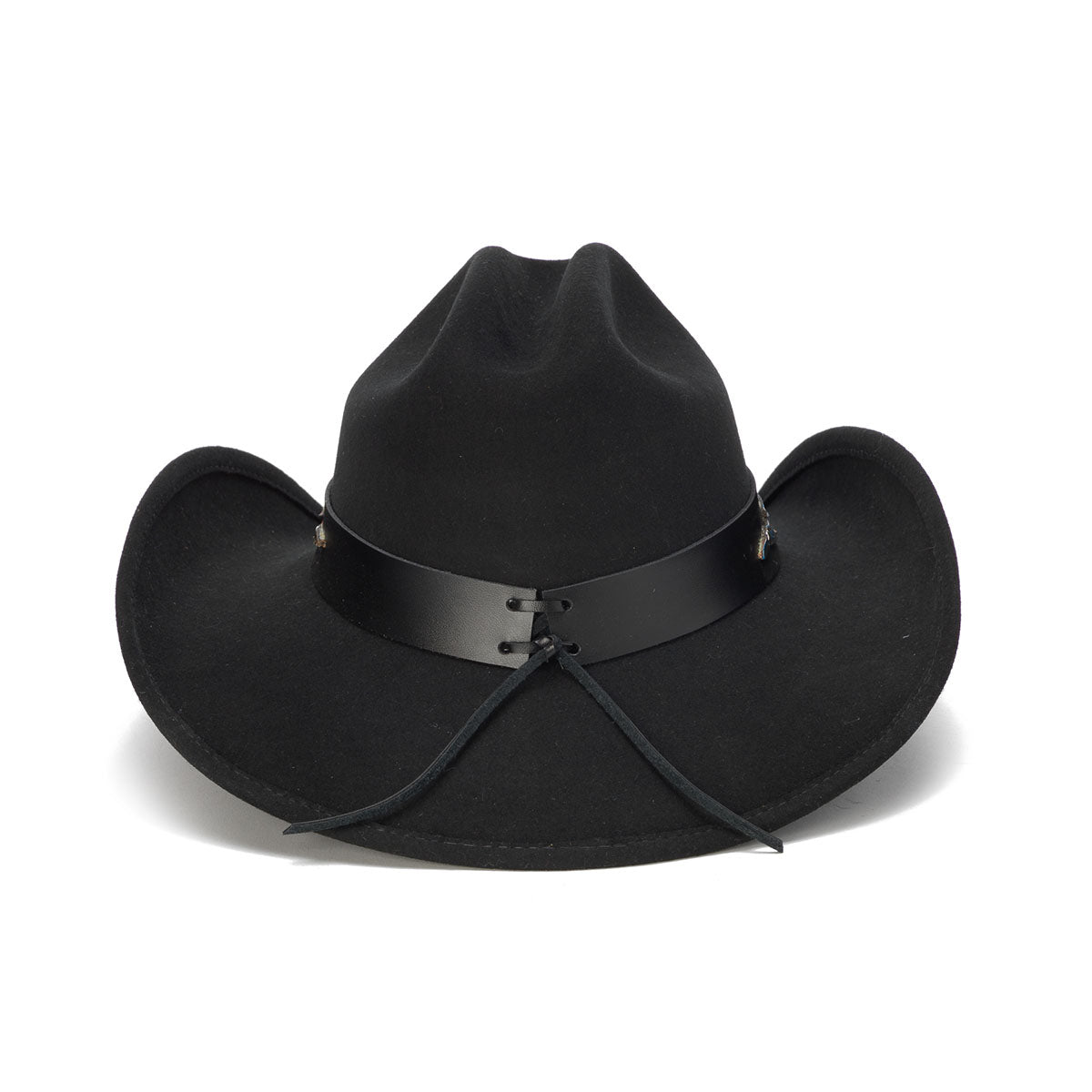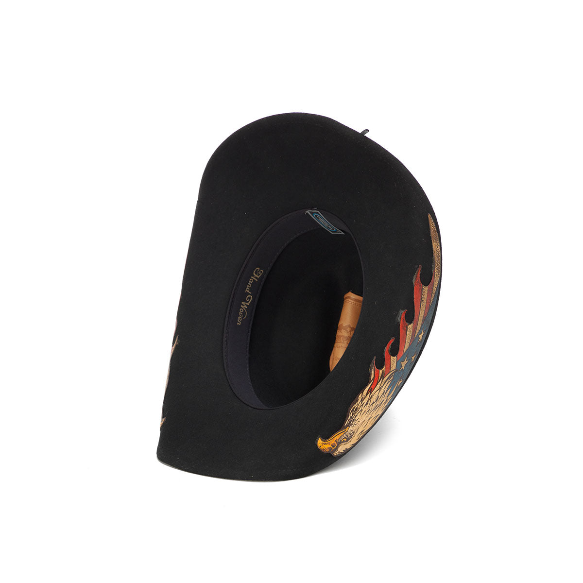 The BILLY hat is a stylish addition to any wardrobe. Crafted with wool felt and genuine leather banding, it features an American flag with flames, USA with wings buckle, and a leather eagle design under the curved brim. With a 4 1/2 inch brim, this piece is part of the Stampede collection, perfect for any outdoor excursion.