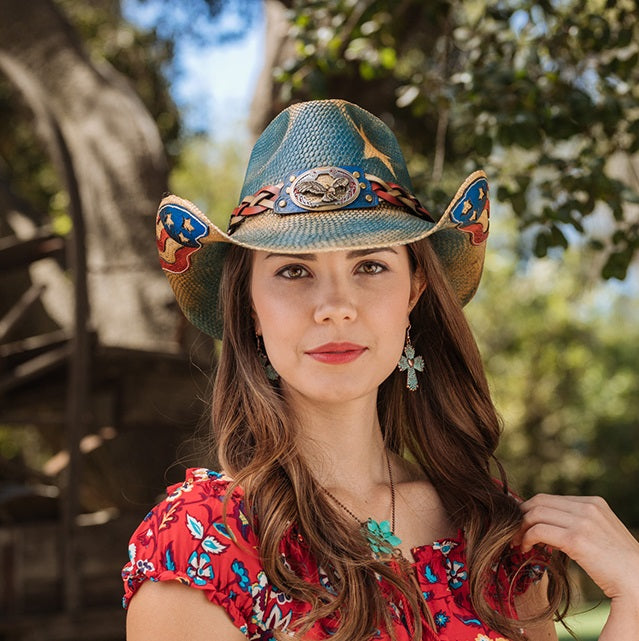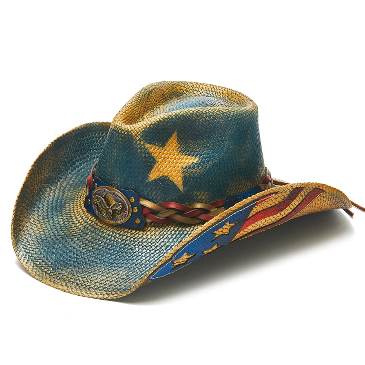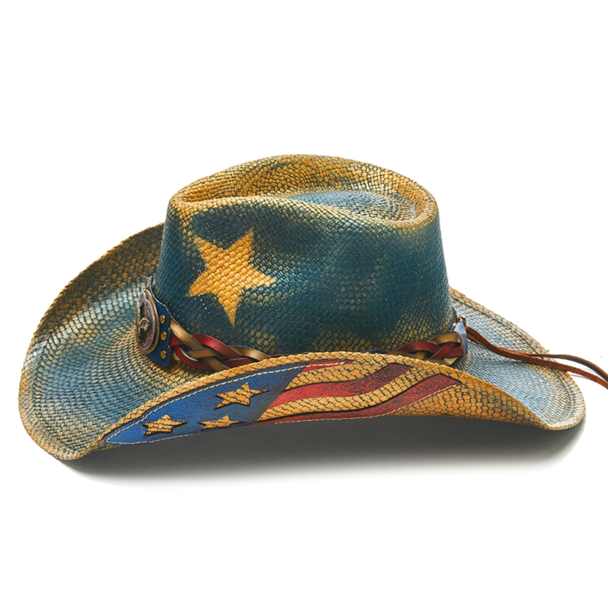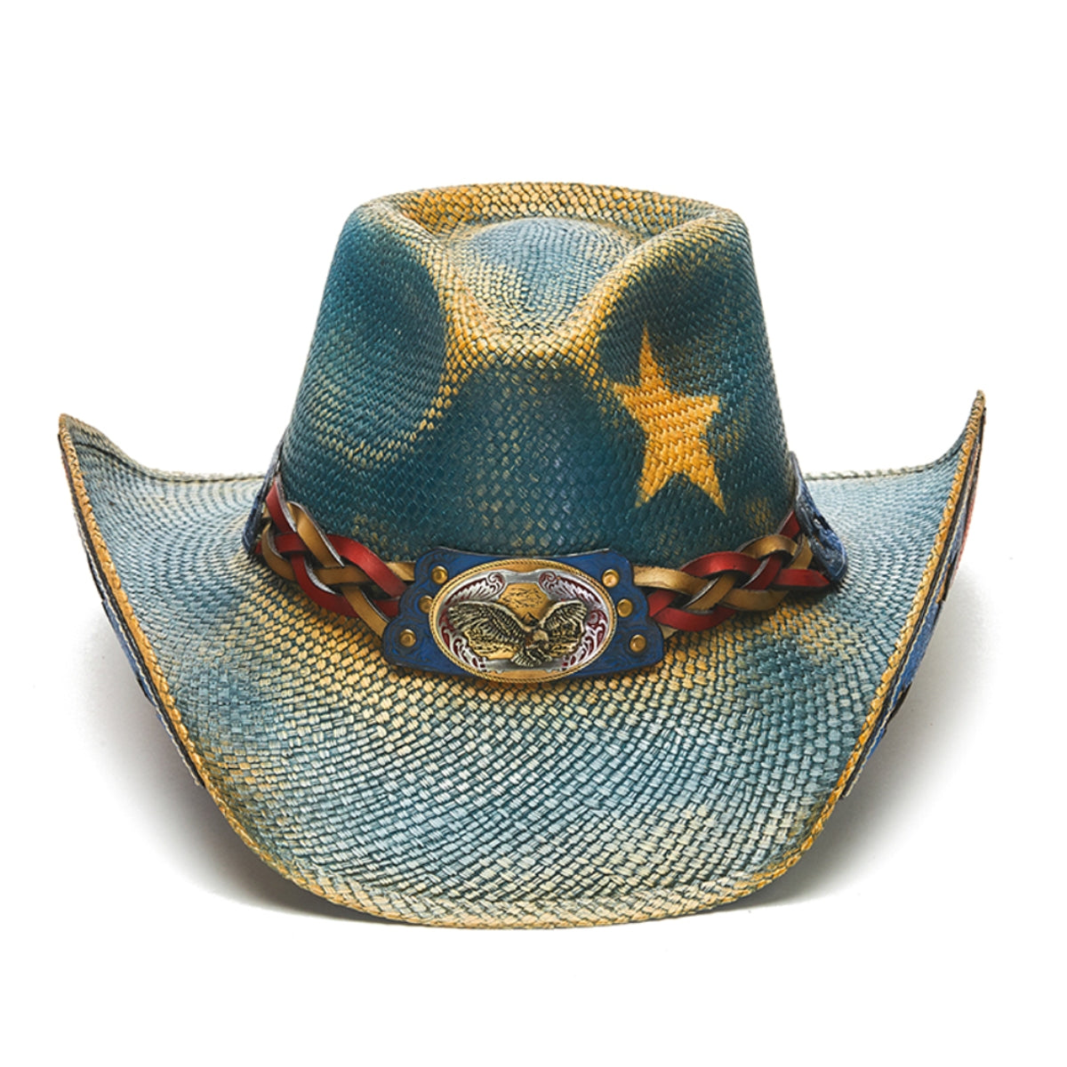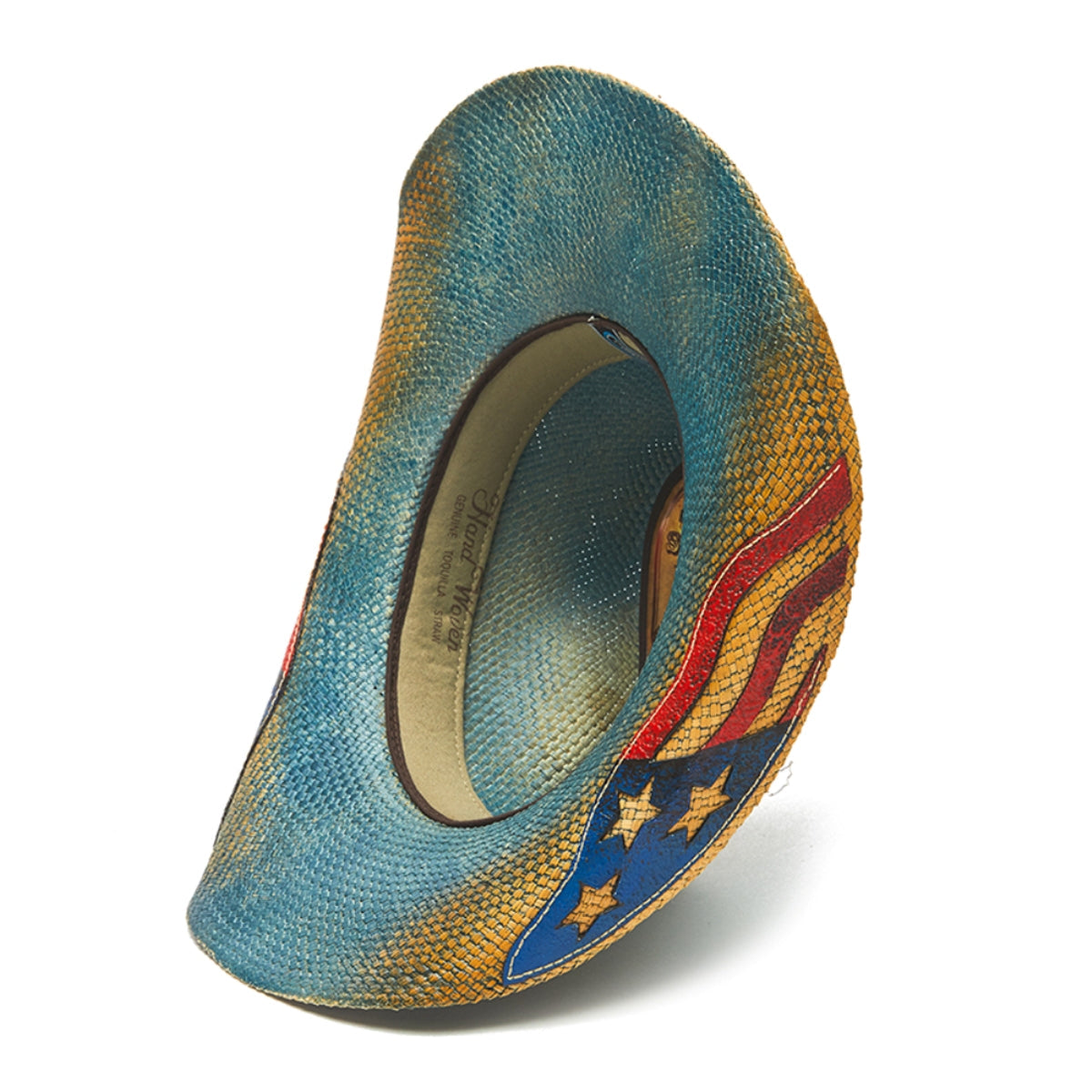 Our BLUE FLAG hat is a must-have for true fashion enthusiasts. Crafted from genuine Panama straw and a genuine leather band, this hat offers a classic American flag design under the 4 inch brim. The perfect finishing touch? An American eagle buckle. Don't miss out on the timeless elegance of the BLUE FLAG hat from the Stampede Collection.