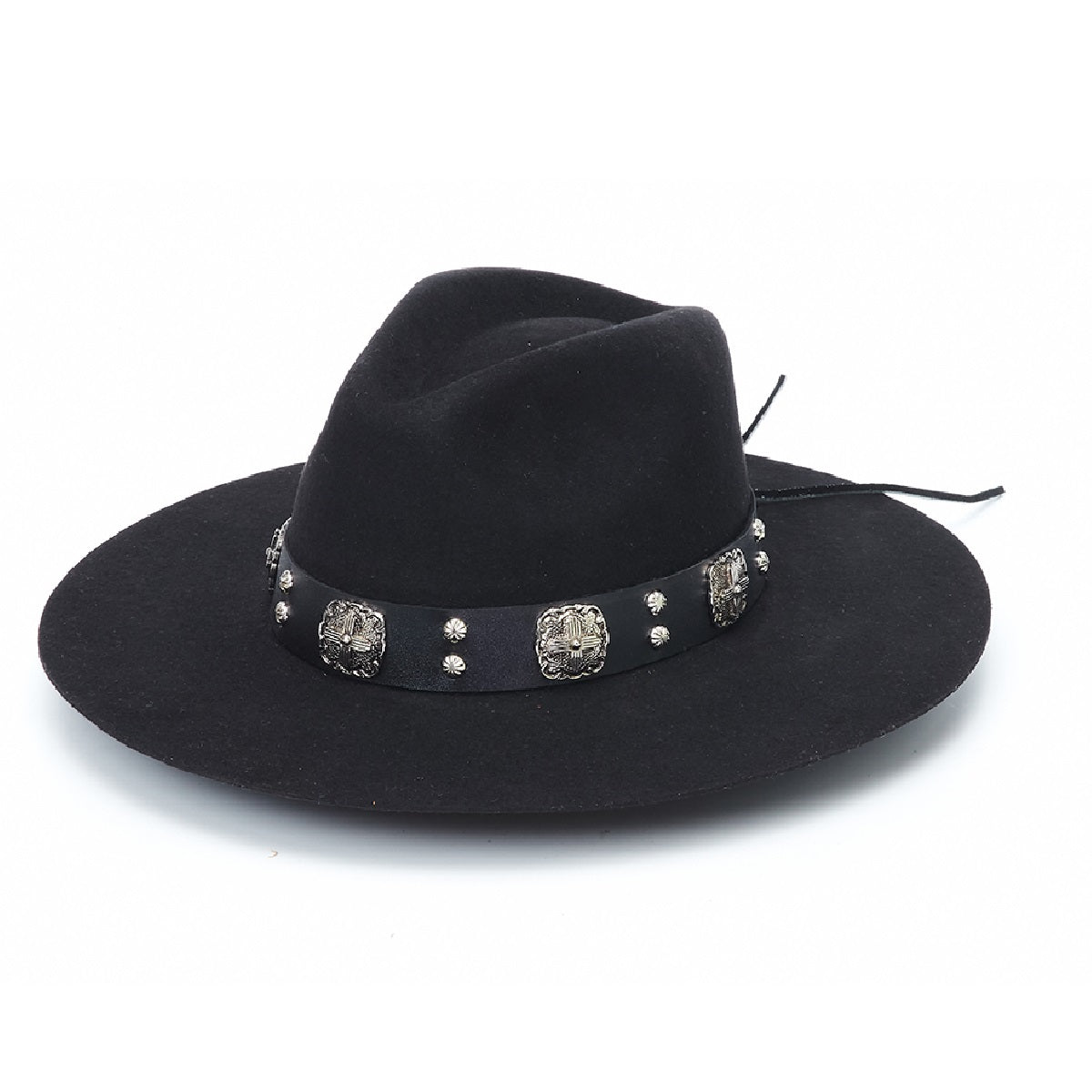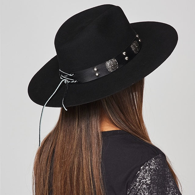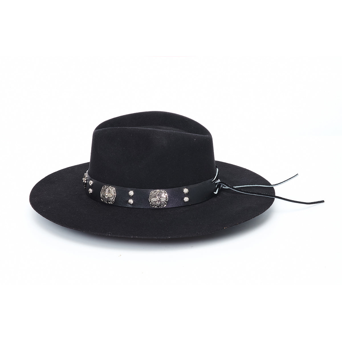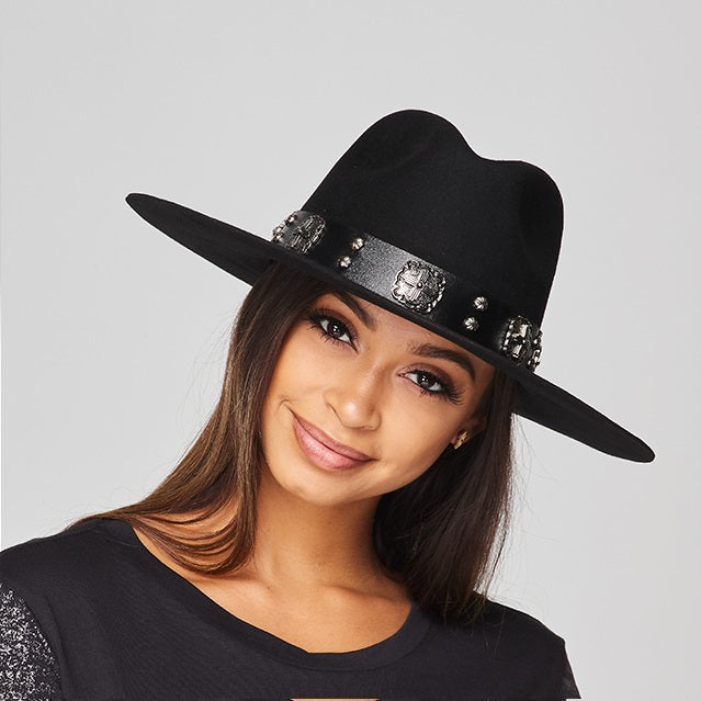 The BRONC HAT is a high-quality hat constructed with wool felt and genuine leather band. It features mini buckles and mini studs, plus a stylish 3.75 inch flat brim. From the Stampede collection, this hat is sure to be a crowd favorite.