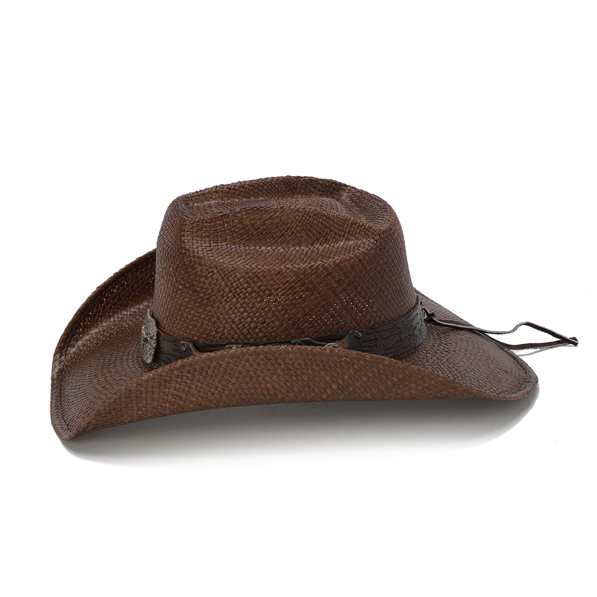 The Buckaroo hat is a stylish, premium accessory from the Stampede collection. Crafted with genuine Panama straw, a genuine leather band with star pins, and a distinctive longhorn buckle, this hat is sure to set you apart from the rest. Its 3.75 inch brim provides full sun protection, perfect for outdoor activities.