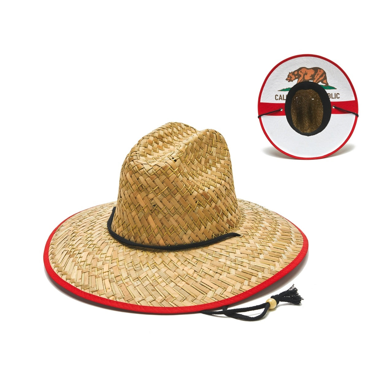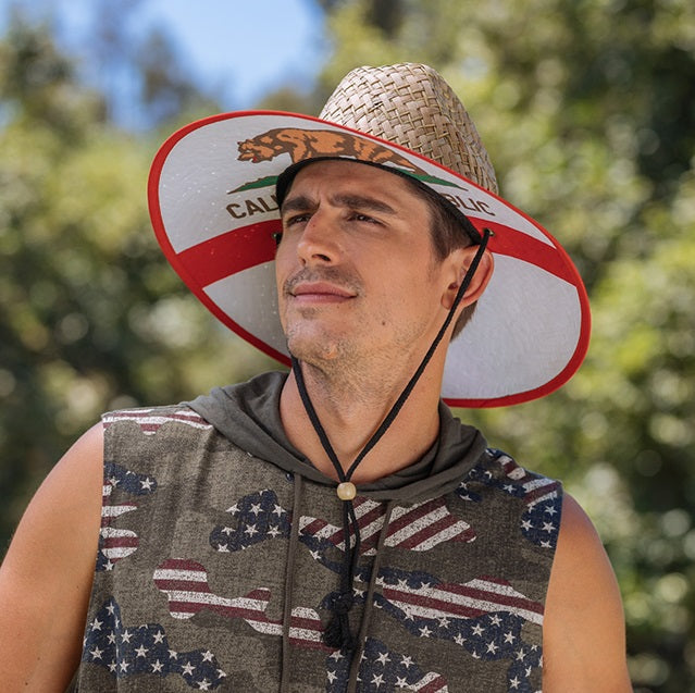 Protect yourself with CALI REPUBLIC's high-quality hat. Features include a palm straw material, adjustable chin cord, 5 inch brim, and U.V. Sun Protection. An elastic fit ensures it's comfortable for all-day wear, and the classic straw hat look is completed with the California Republic flag under the brim.