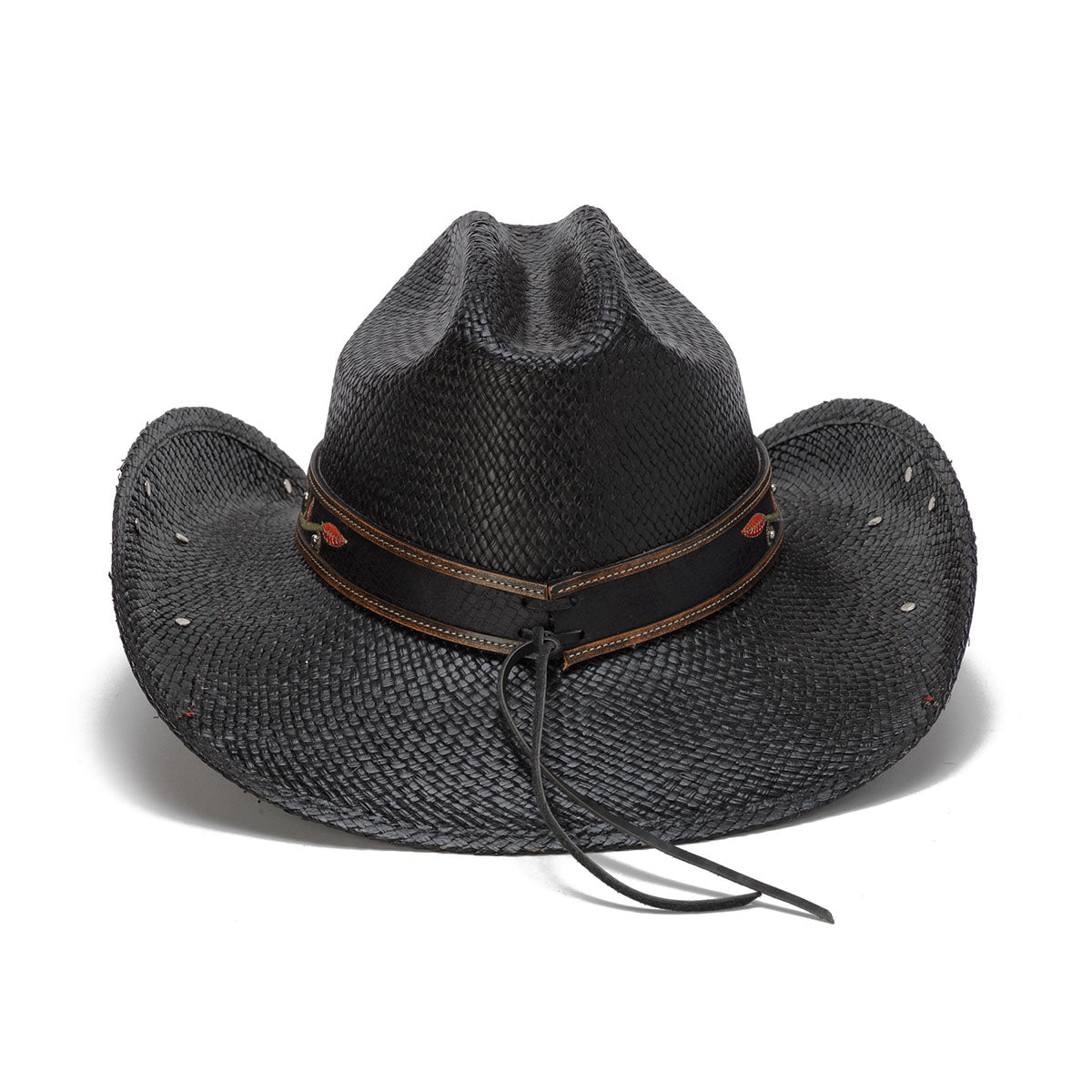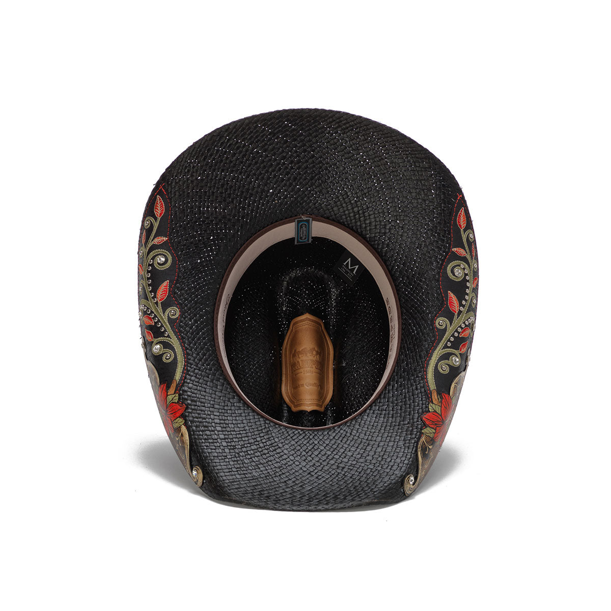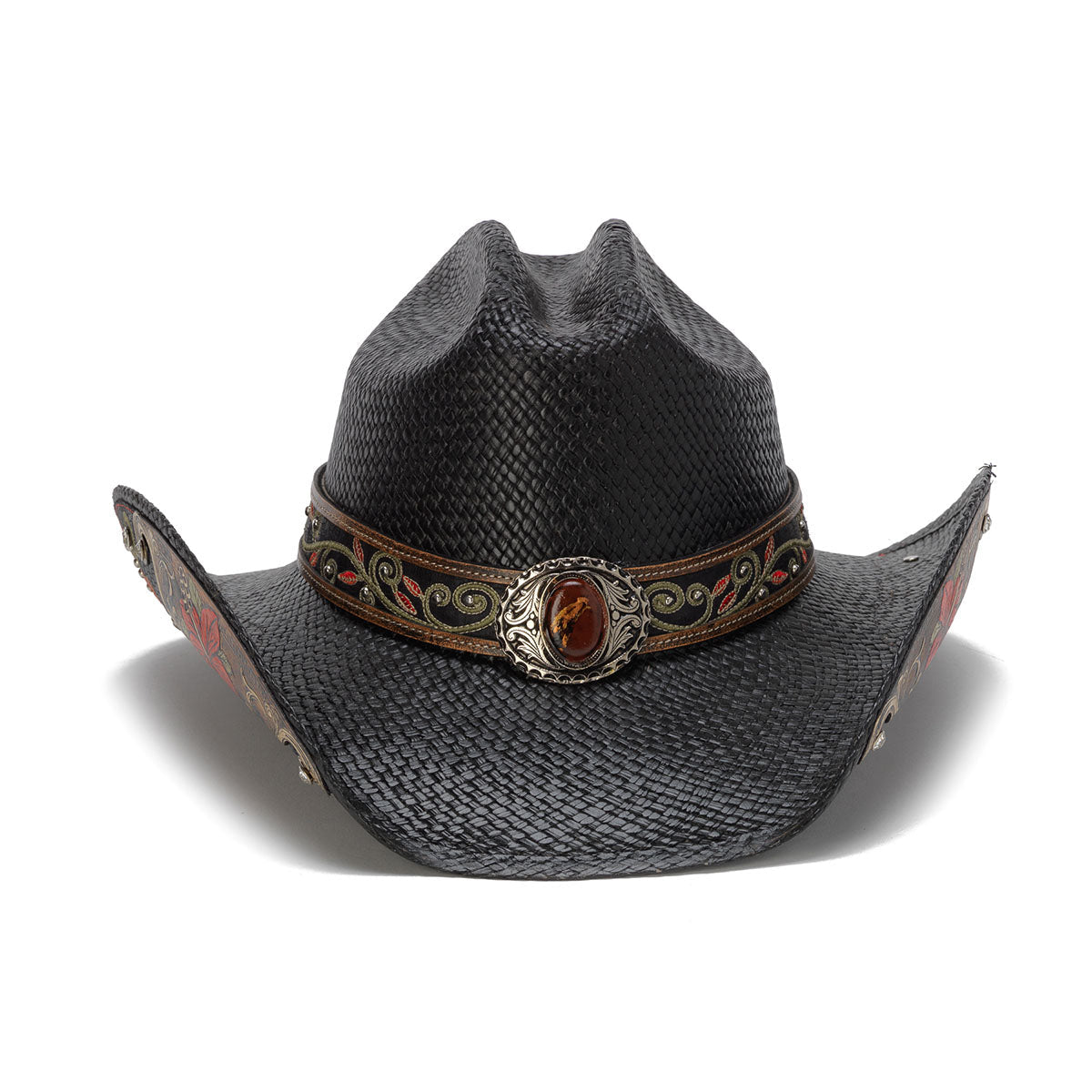 CARLY is a genuine panama straw hat featuring a large brown gem buckle, a floral design on black genuine leather, and a floral design with studs underneath the curved brim. Perfect for your stampede collection, this hat has a 4 inch brim to provide you with maximum protection from the sun.