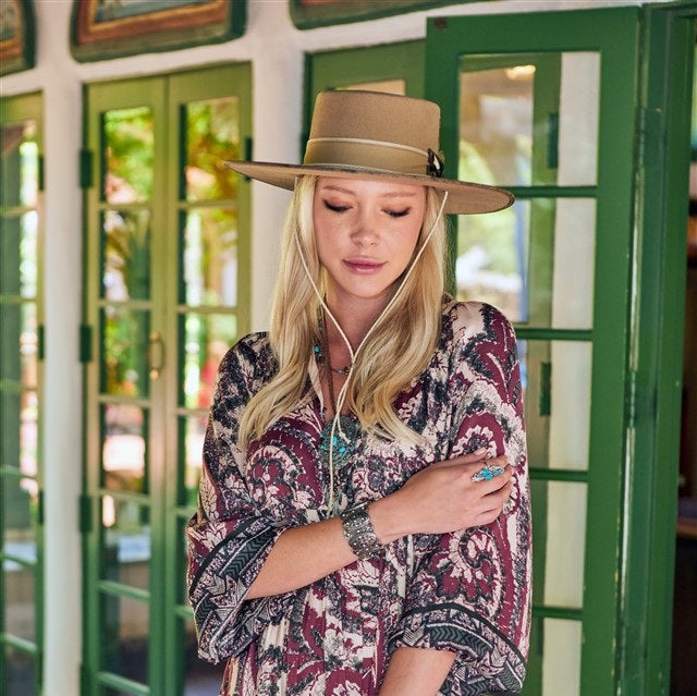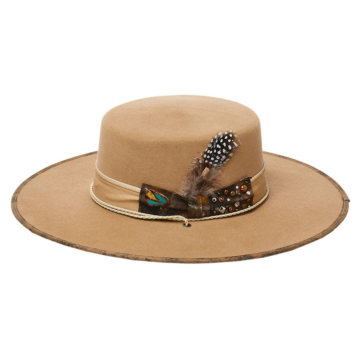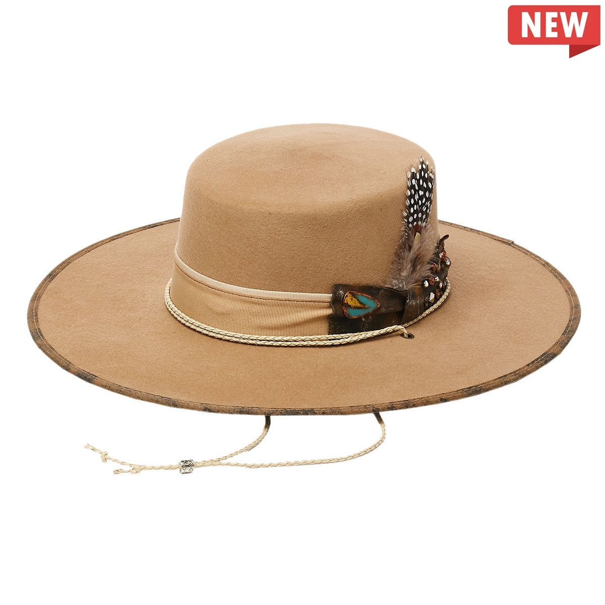 CAROL is the perfect hat for a western look. Crafted from wool felt with a polyester ribbon, turquoise pin, and mini studs for added detail. It features feather inserts and a braided chord for a unique flair. Adjustable chin strap ensures comfortable wear, while a 4 inch flat brim gives you just the right amount of sun protection. From the Stampede Collection, CAROL guarantees to make you stand out.