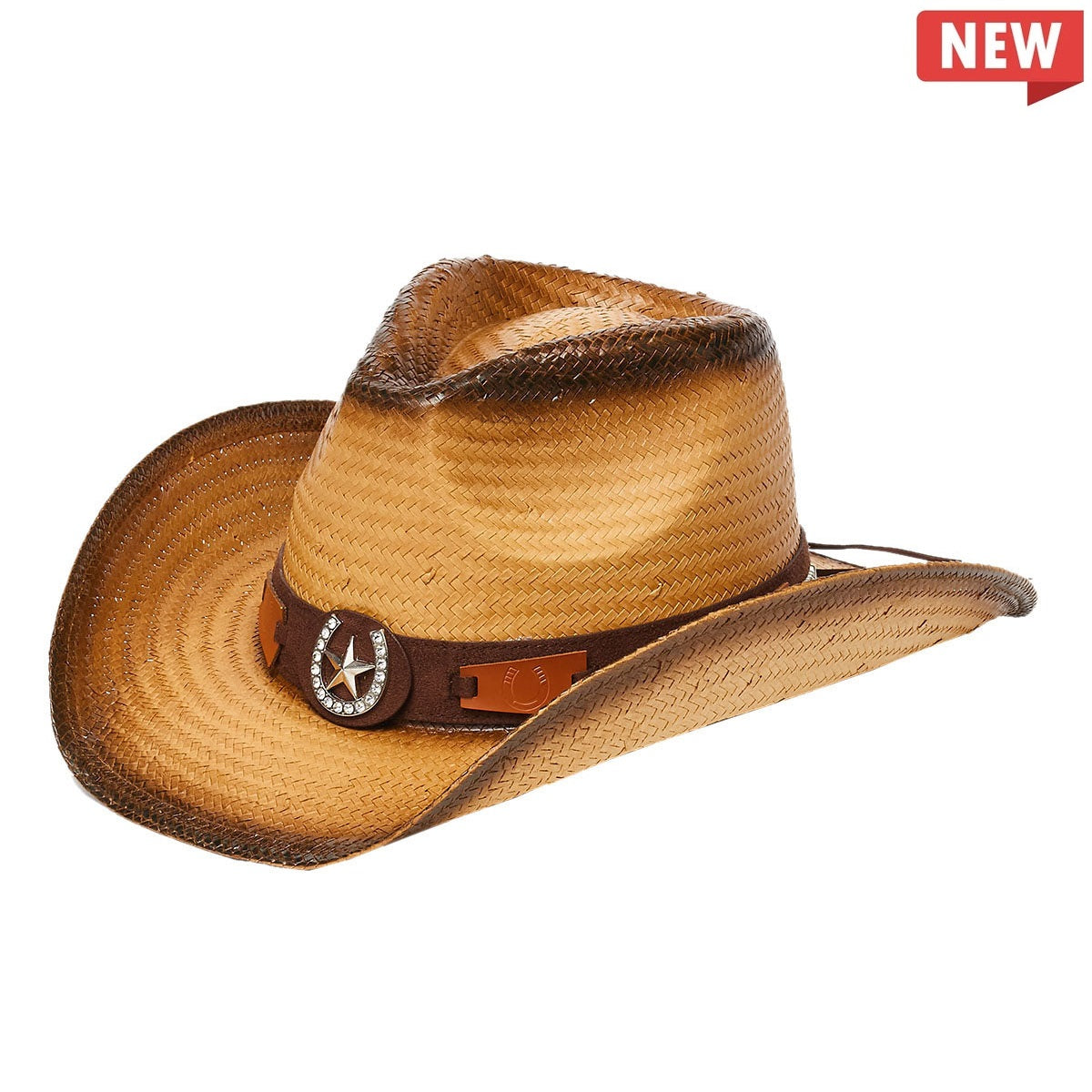 CH20-2282 from the Saddleback Collection offers a timeless country western style, crafted with a genuine Toyo straw with a genuine leather band and horseshoe engraving. The 3.5 inch shapeable wired brim and horseshoe and star buckle add a unique flair to the classic look.