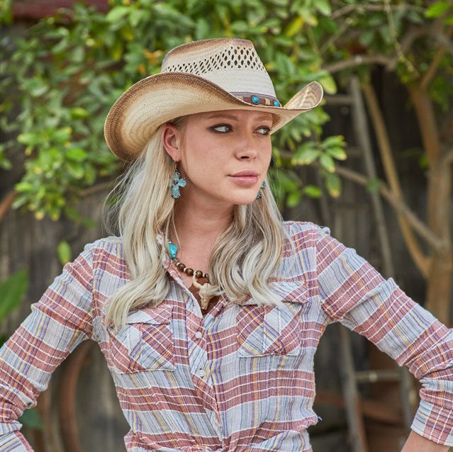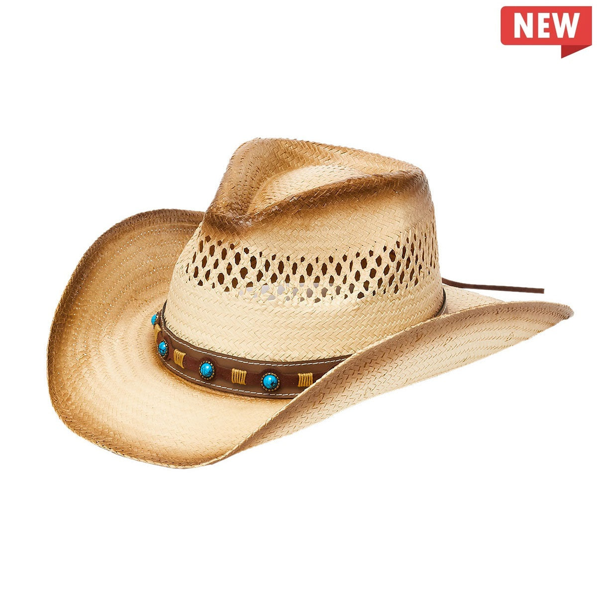 The CH20-2288 is a sophisticated hat from the Saddleback Collection. For a stylish look, it combines Toyo straw and genuine leather with turquoise bead and stitching detail. The shapeable wired brim provides flexibility, while the 3.5 inch brim with vented crown ensures breathability for a comfortable wear.
