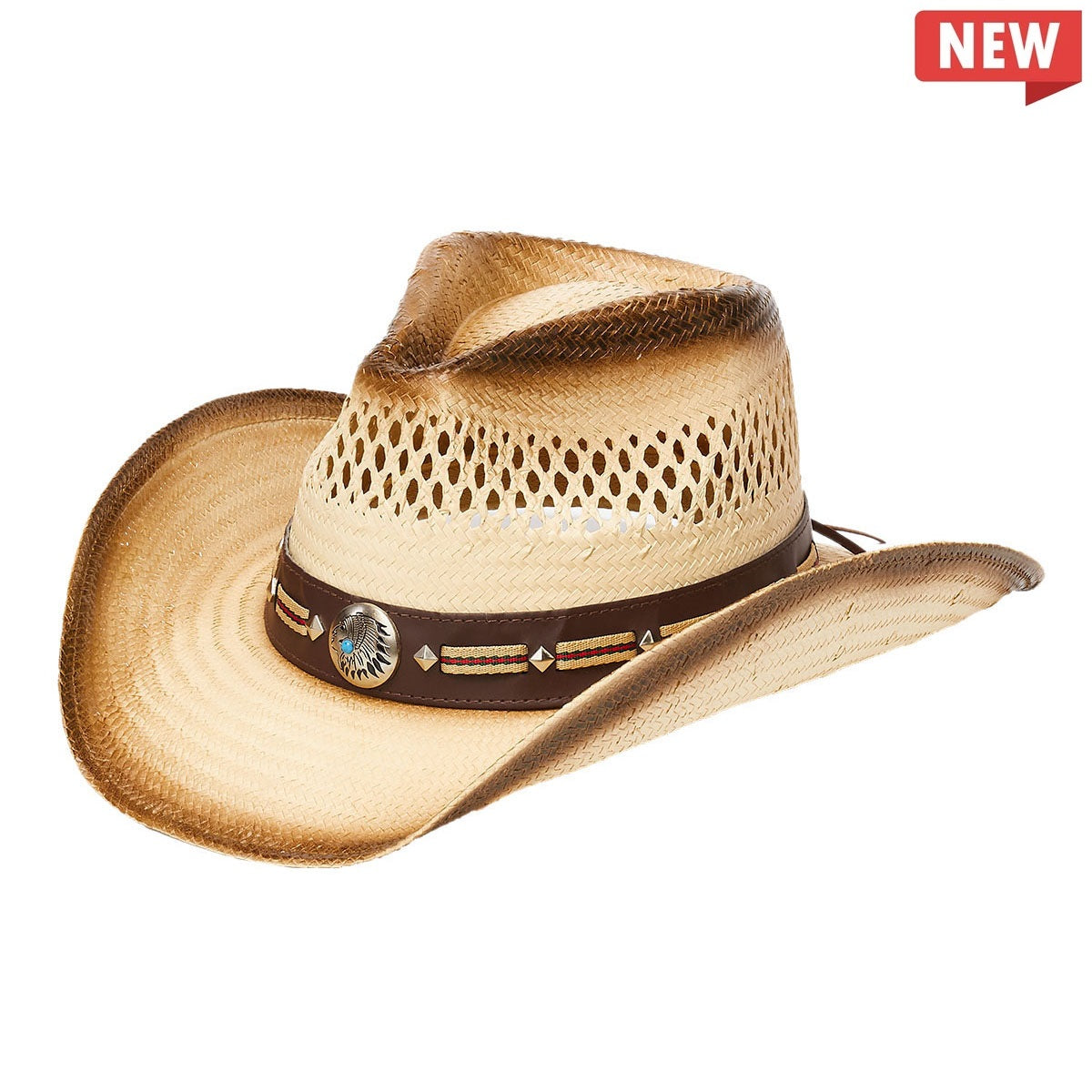 The CH20-2290 hat from the Saddleback Collection is an exquisite piece of craftmanship. It features a genuine Toyo straw body along with a genuine leather band with strips and square studs, and a turquoise jewel and Apache buckle. The shapeable wired brim and vented crown measure 3.5 inches, making this hat stylish and functional.