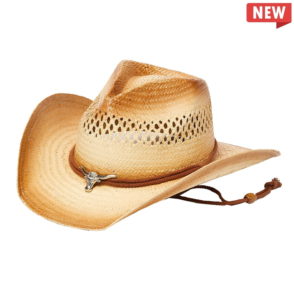 The CH20-2294 from Toyo Straw features a genuine leather braid, adjustable chin chord, and a large longhorn pin, perfect for a western-style look. Its shapeable wired brim with a vented crown measures 3.5 inches, making it part of the Saddleback Collection. Enjoy the quality and comfort of this stylish hat.