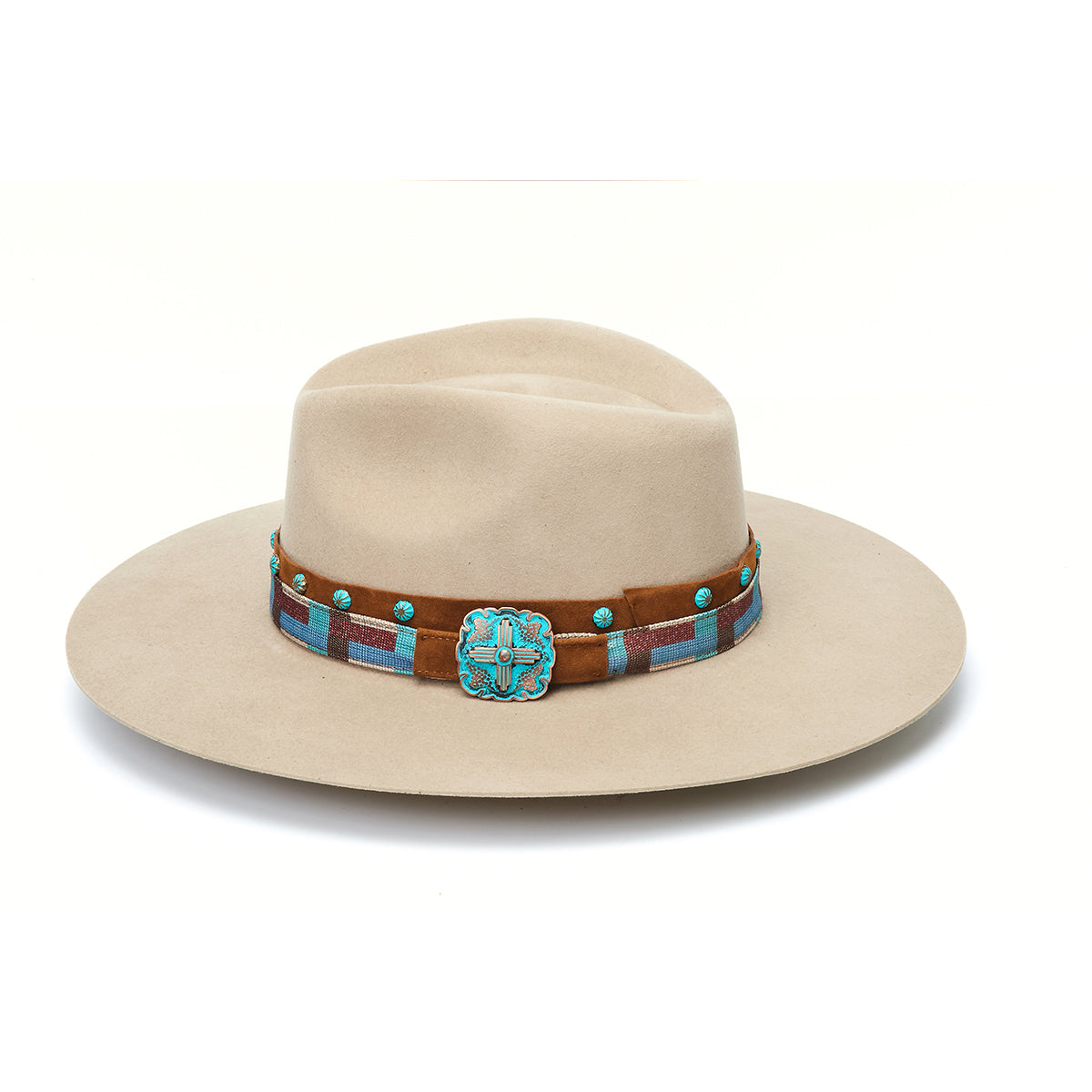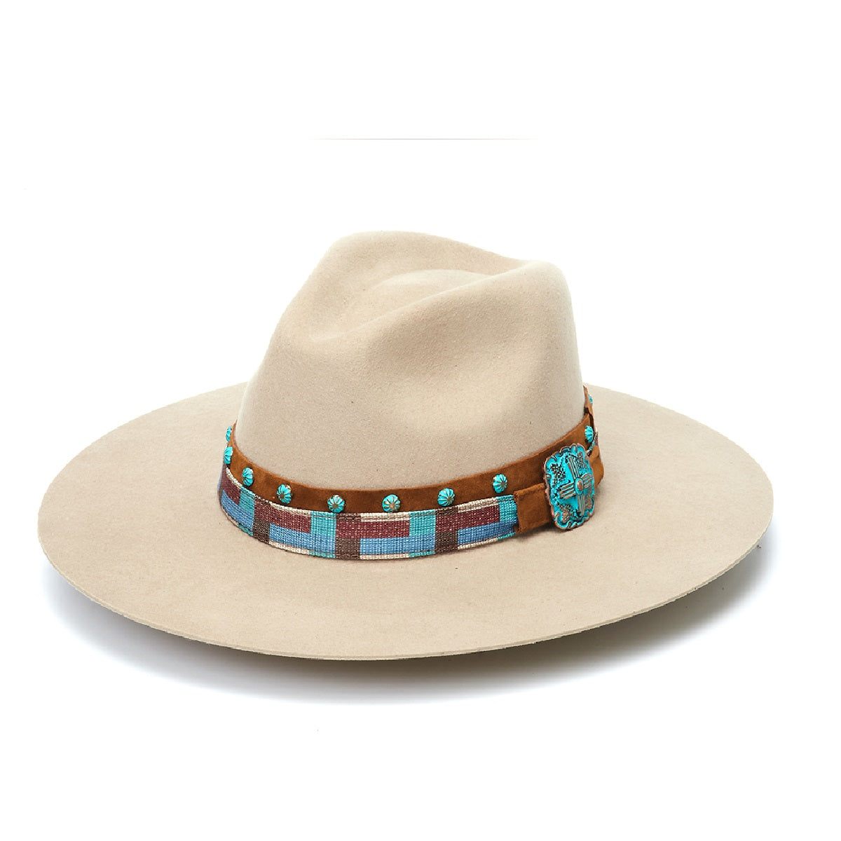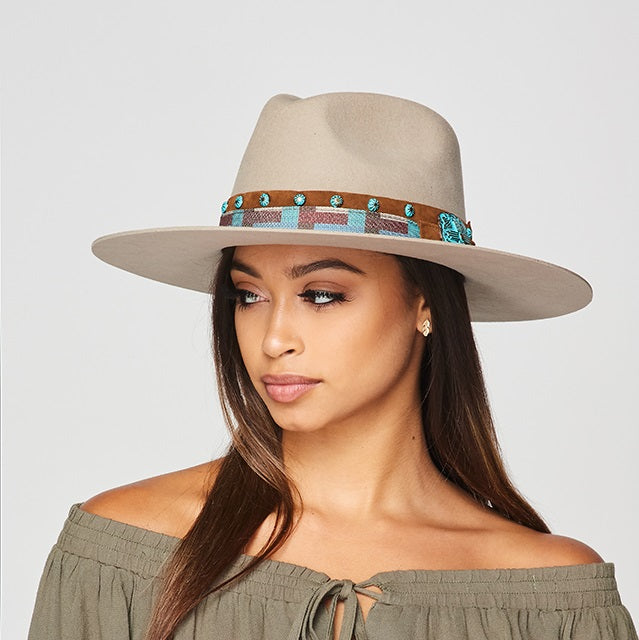 CHARLENE is the perfect way to make a statement. This stylish hat is crafted from quality wool felt and features a unique turquoise buckle. The genuine leather band adds an eye-catching touch with stylish turquoise studs. With a 3.75 inch flat brim, CHARLENE is sure to turn heads and make an impression. A must-have piece from the Stampede Collection.