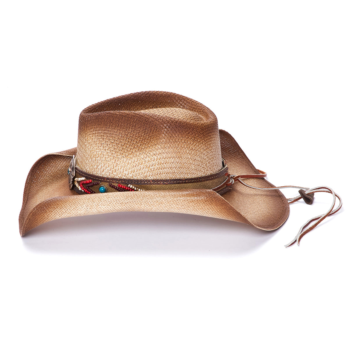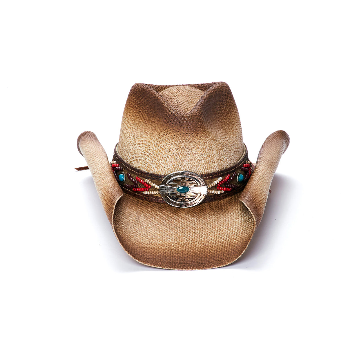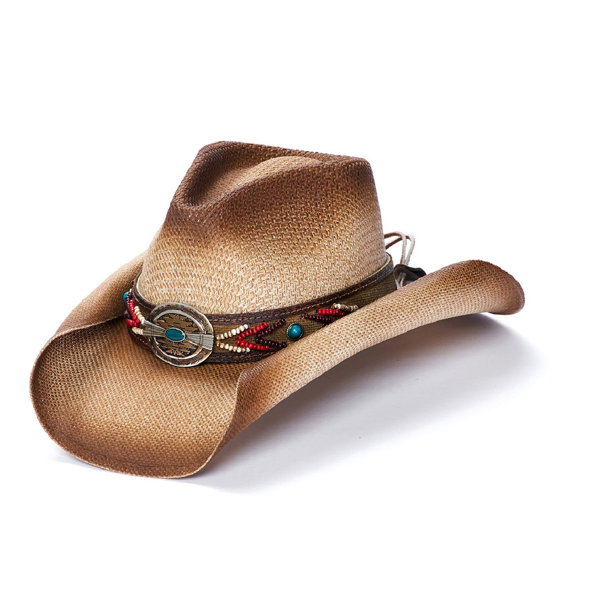 The Circle Rider from the Stampede Collection features a high-quality canvas construction and genuine leather band adorned with turquoise jewels and colored beads. The turquoise jewel buckle provides a secure, adjustable fit, and the 3.75 inch rolled brim offers protection from the elements. Ensure lasting quality and style for your outdoor adventures with the Circle Rider.
