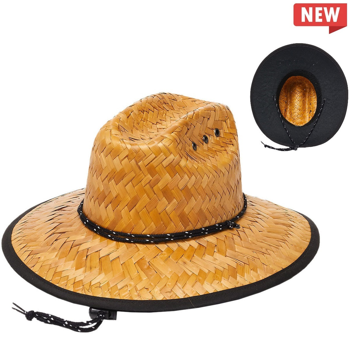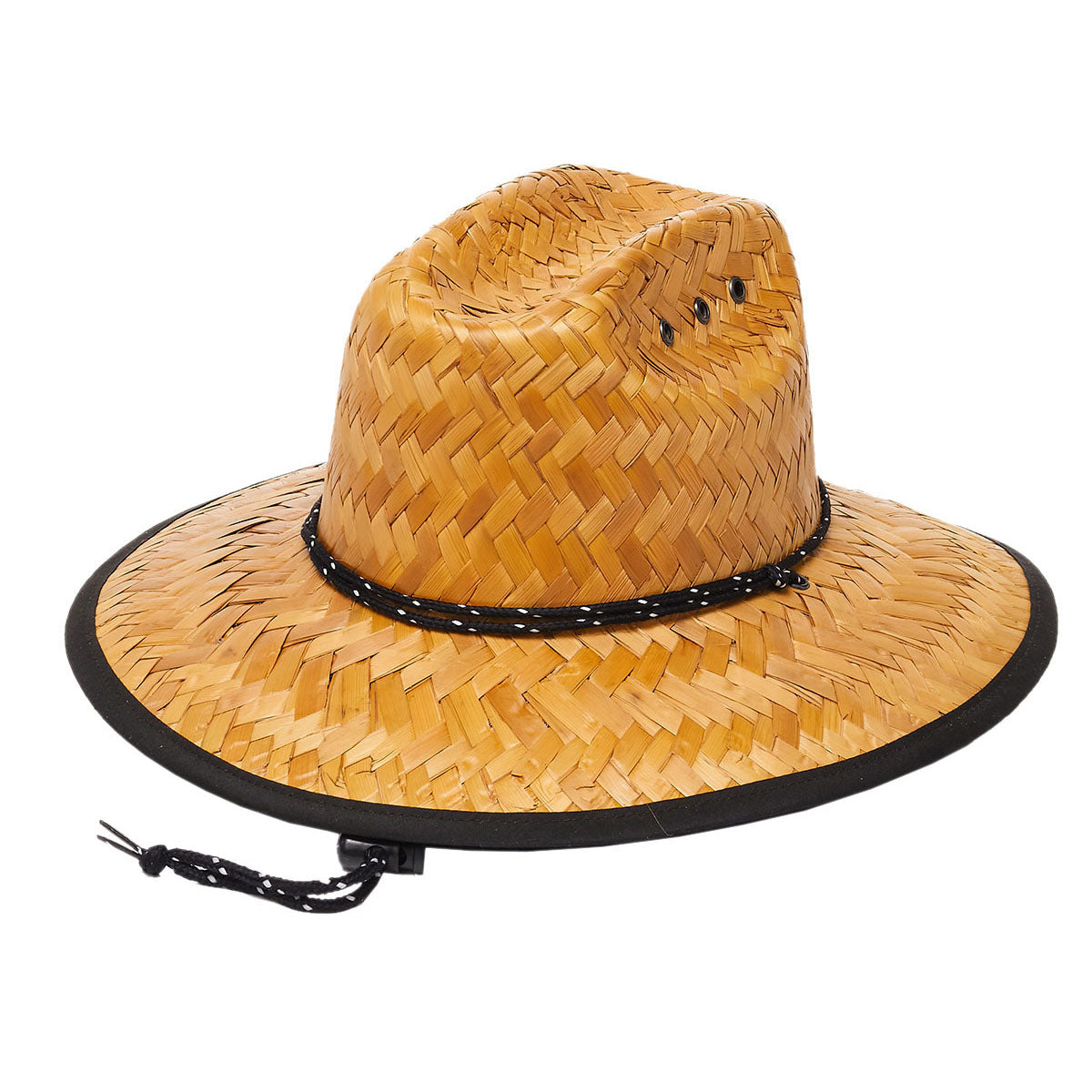 This classic, straw-look hat is perfect for lifeguard duty. Featuring a 5-inch brim, adjustable chin cord, and durable palm leaf construction, it provides UV sun protection and an elastic fit for long-lasting comfort. With a vented crown and black fabric under the brim, this hat is designed to keep you cool during summer days at the beach.