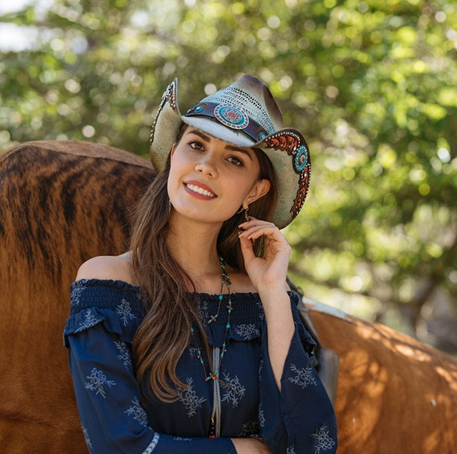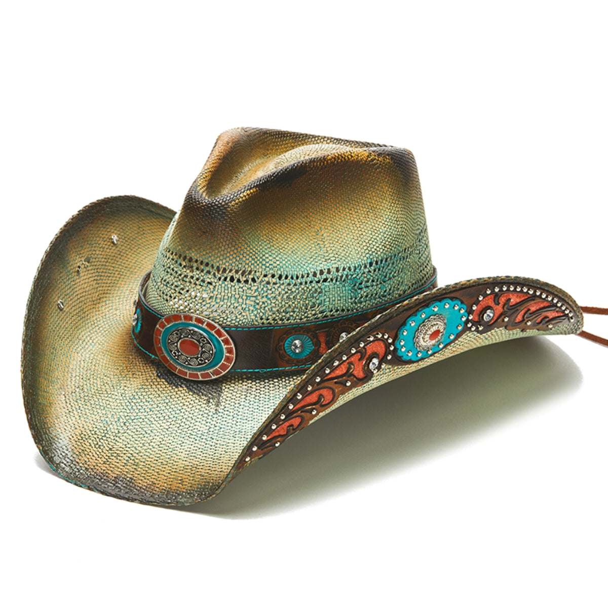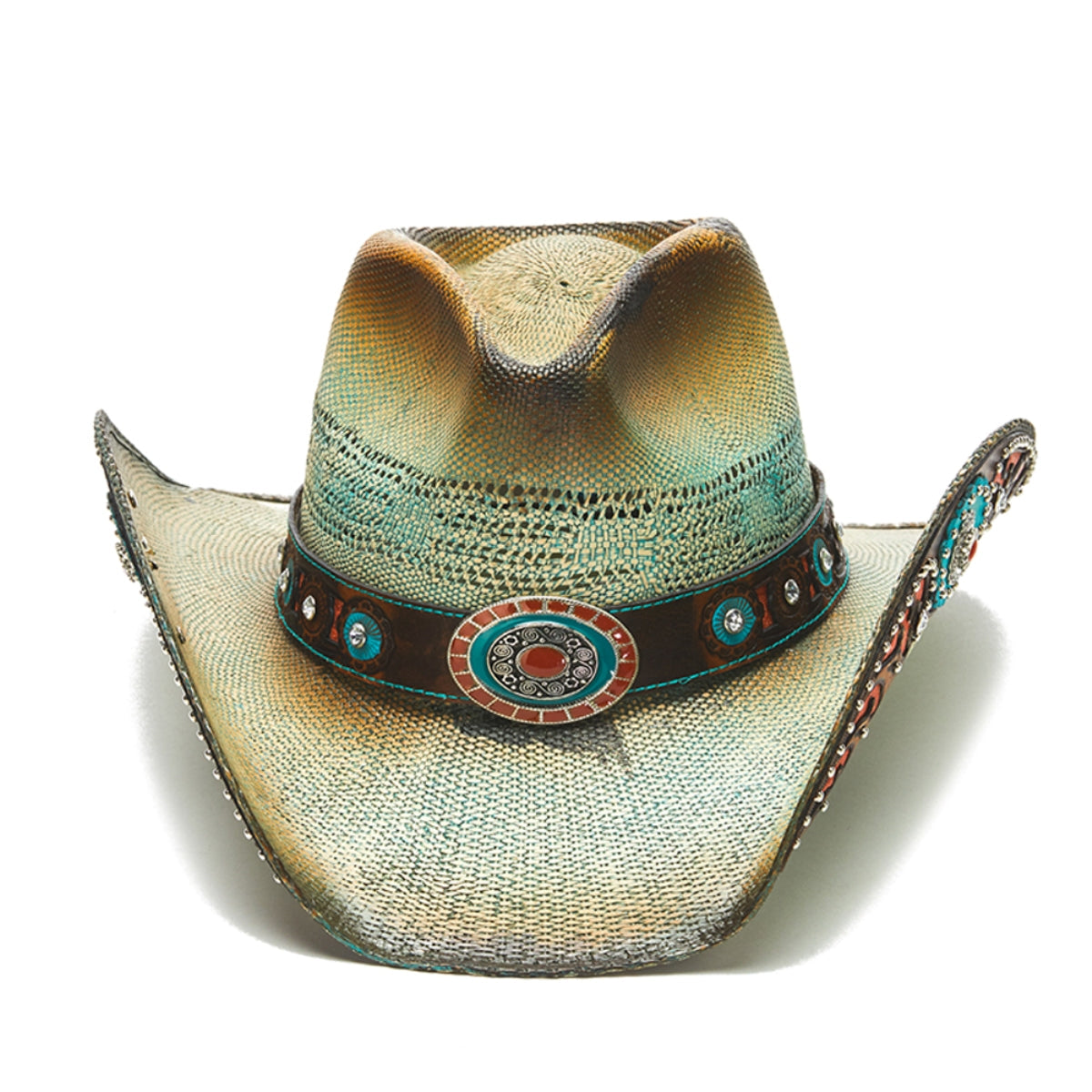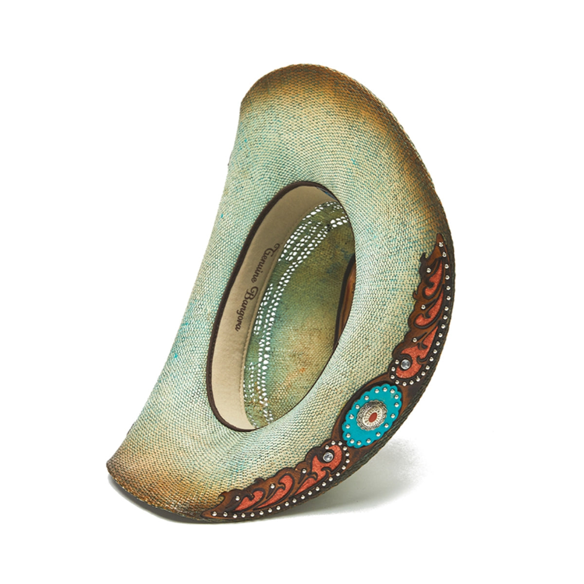 This COPPER FADE hat from the Stampede Collection is made from genuine Bangora straw and features an intricately designed brim with mini studs and a genuine leather band with large studs. Its 4 inch brim is vented for the perfect fit and its rolled brim sports a signature red pin.