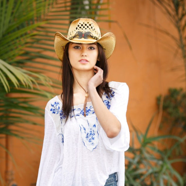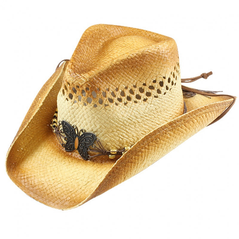 The CS60-25 features a high-quality tea stain toyo straw, a vented crown, and a butterfly concho. It is made with a corded chin cord and an elastic band to ensure the perfect fit.