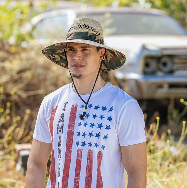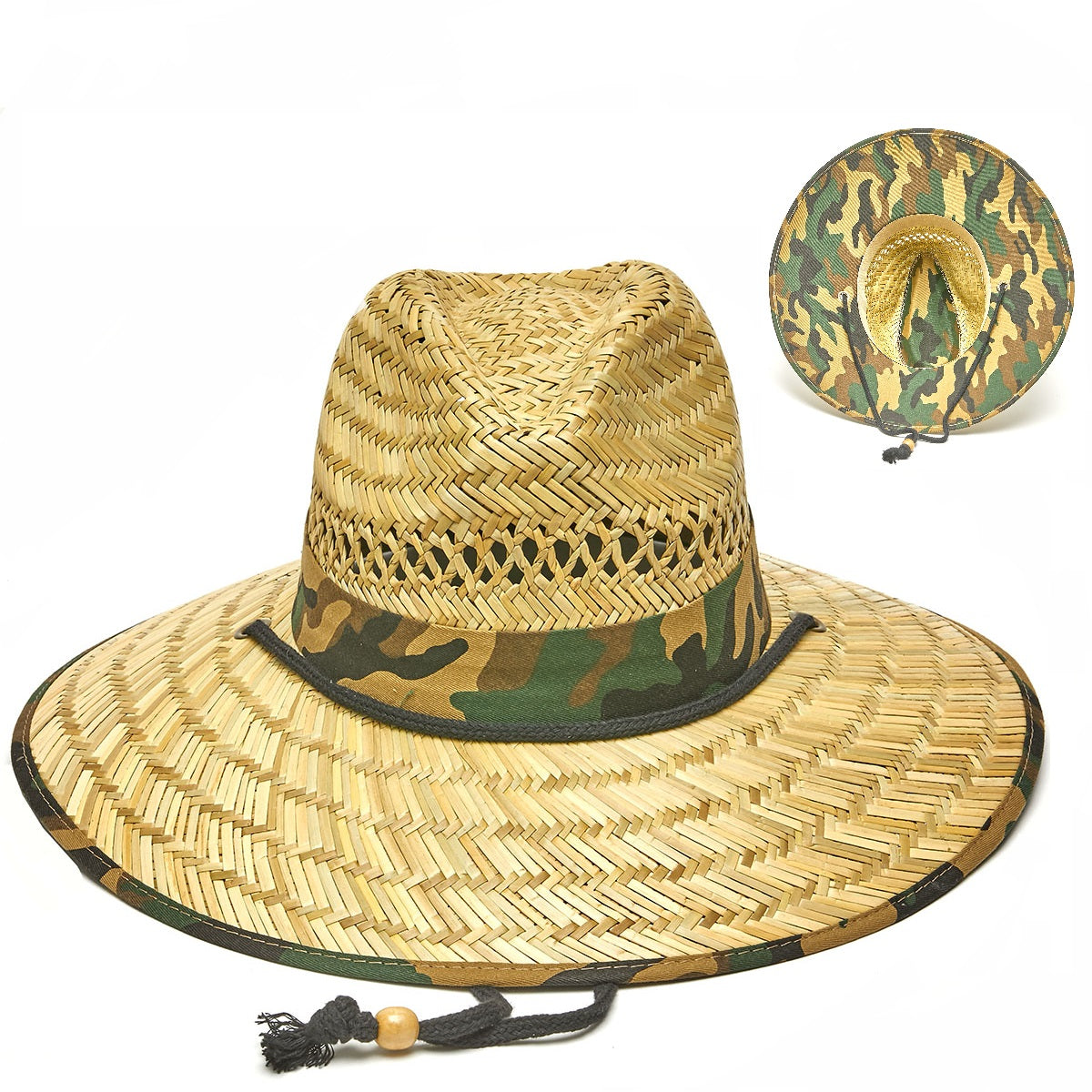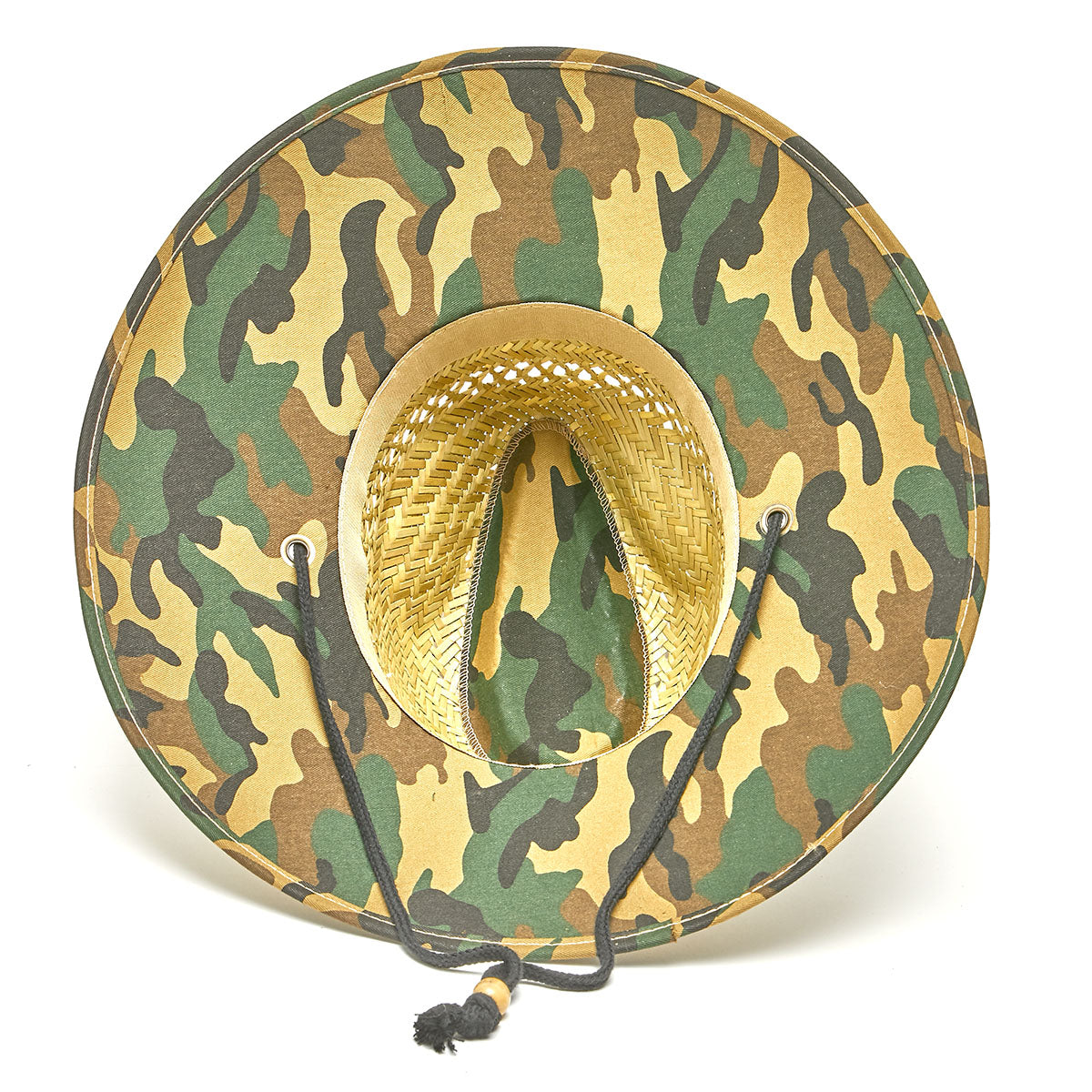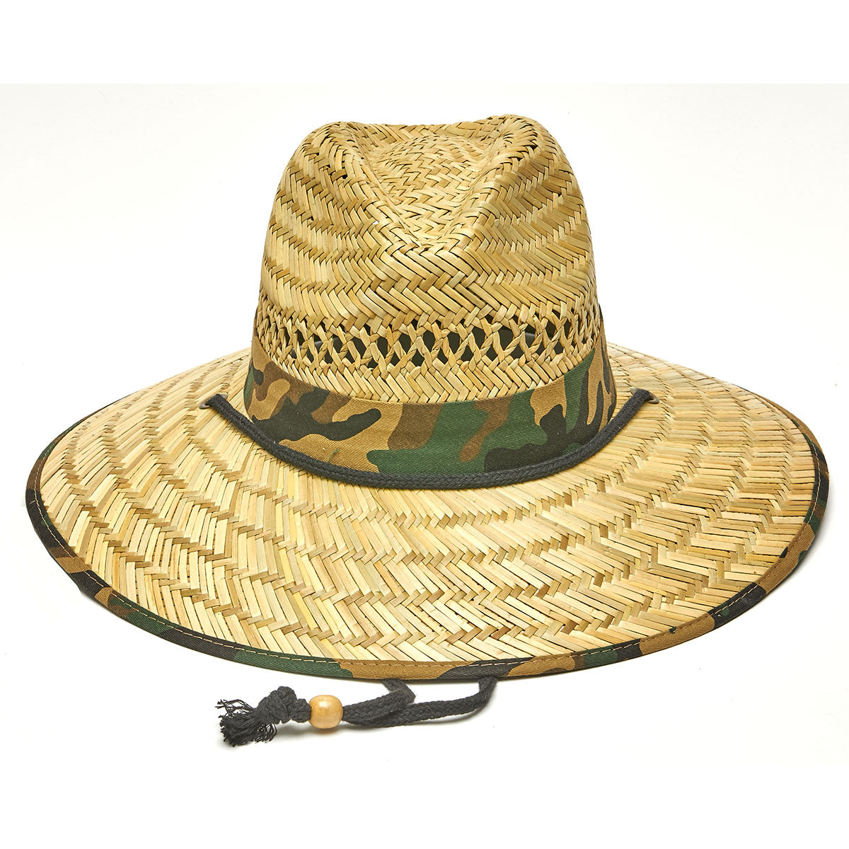 The DAKOTA is the perfect hat for your outdoor adventures. It has a 5 inch brim for added protection against the sun's rays and a U.V. Sun Protection label for up to 98% sunblock rating. The adjustable chin cord and elastic fit ensure a secure and comfortable fit while the classic straw hat look gives a timeless stylish appeal. Adding some extra flair, the camo design under the brim and on the band gives the hat a unique touch. With the vented crown and rush straw material, this hat is sure to keep you cool while making a statement.