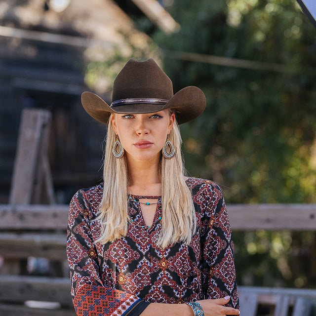 Dolly is part of the Stampede Collection, featuring a genuine leather band with stitching and mini studs, a wool felt body, and a 4 inch brim. Its classic look is perfect for any occasion, whether it's a night out or a day in the sun.