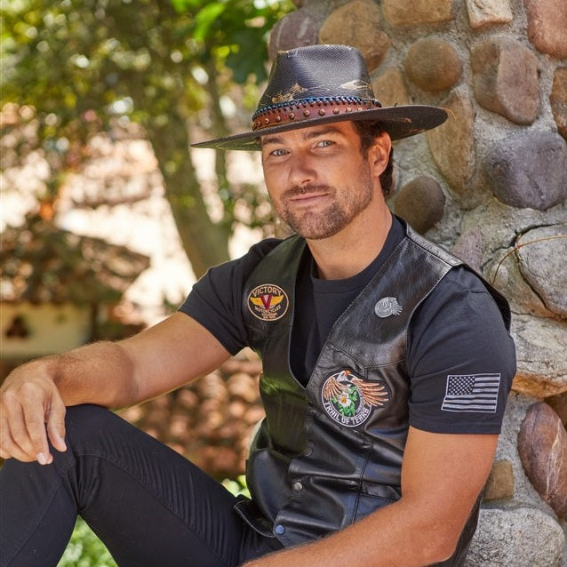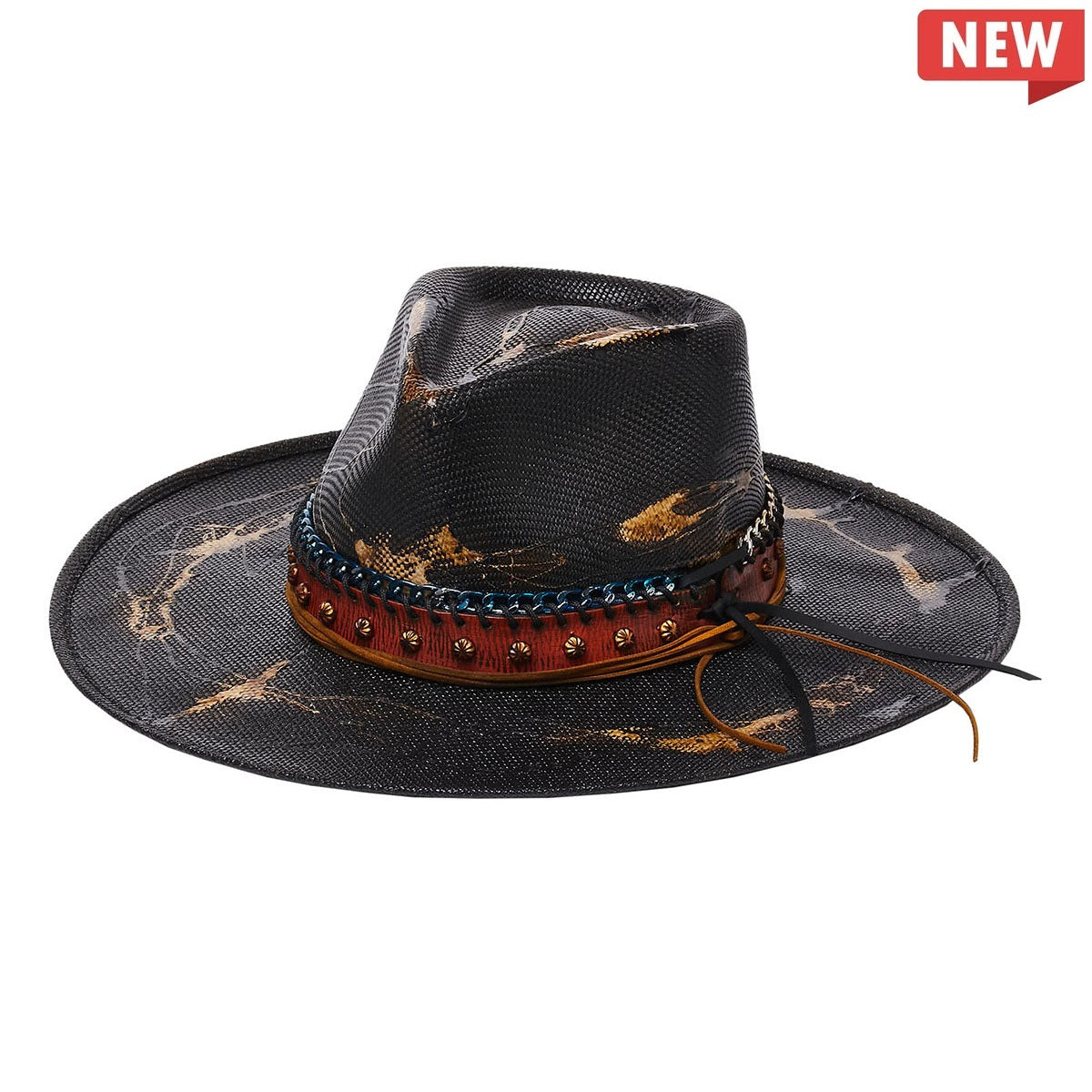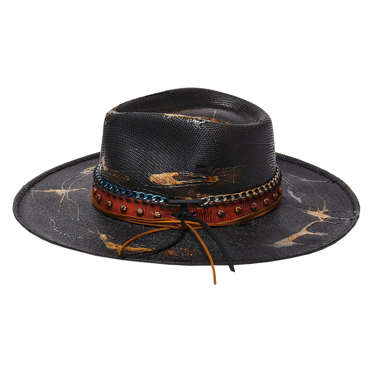 Stylish and rugged, the DURANGO is a must-have for your wardrobe. Crafted with premium canvas and genuine leather band with studs, this piece from the Stampede Collection will turn heads. Notable features include a blue and silver chain link, suede rope, and a unique 3.5 inch flat brim. Show off your unique style with this statement-making piece.
