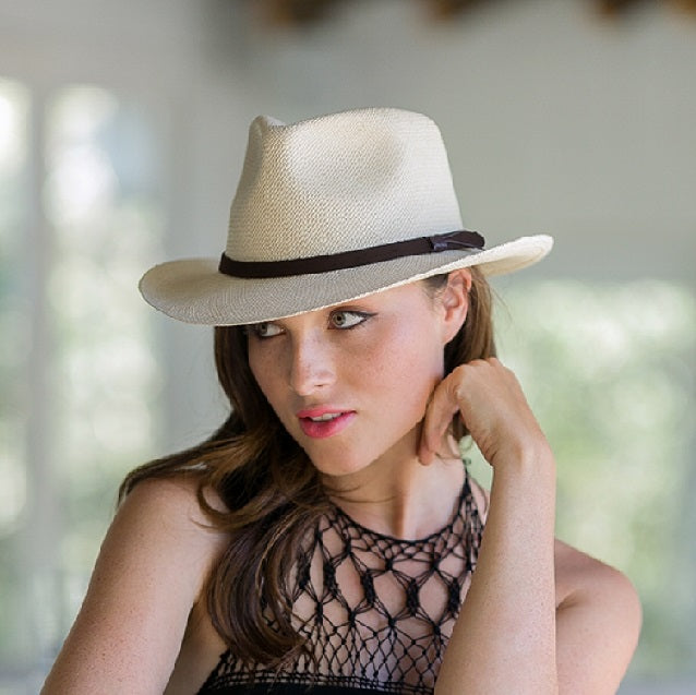 EUNICE from the Austral Panama Collection is a stylish straw hat featuring a genuine Panama straw construction and a genuine leather band with a gold pin. The 2.75 inch brim offers timeless sun protection while giving any outfit a touch of flair.