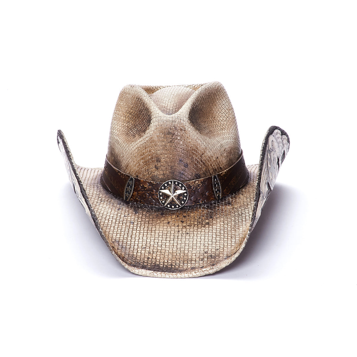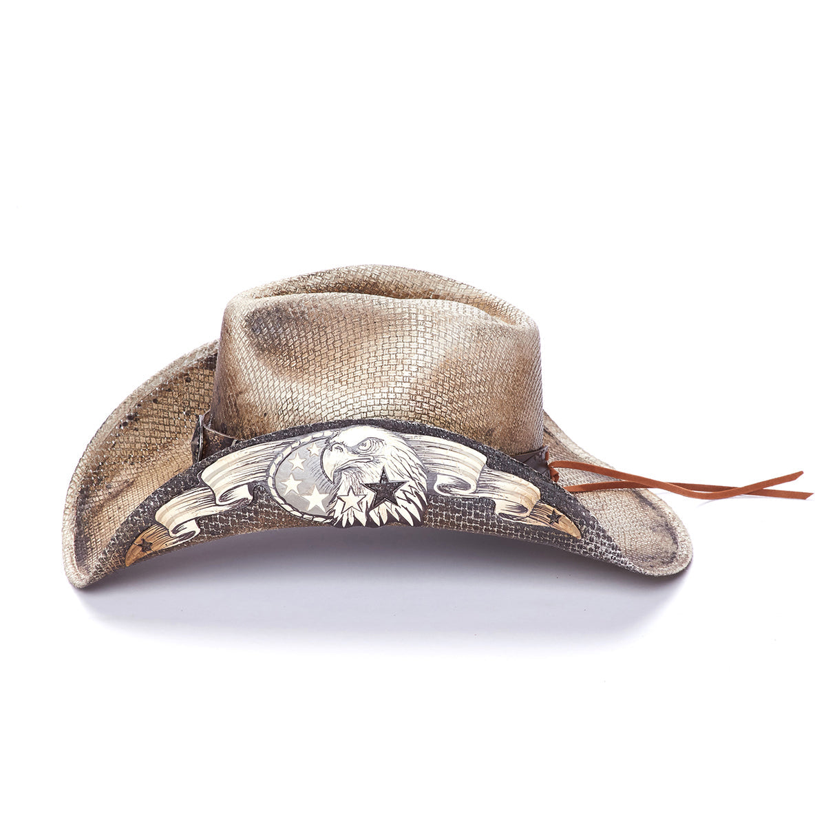 Introducing the GOLDEN EAGLE, part of the Stampede Collection. This stylish hat features an eagle and American flag design on the rolled brim and premium canvas construction. It is finished with a brown leather band and star buckle. The durable material and 3.75 inch brim make the GOLDEN EAGLE the perfect accessory for all your outdoor adventures.