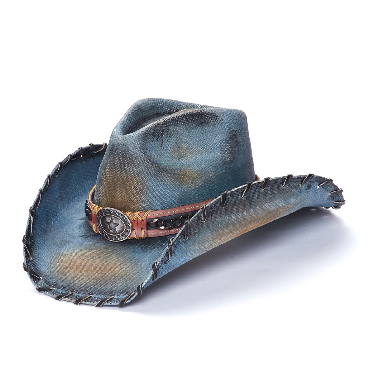 Indy is a part of the Stampede Collection by Texan Hats. With a premium canvas featuring genuine leather band with cross stitching, chain link, and leather stitching on the brim, this hat is built for long-lasting durability. The 3.75 inch rolled brim and large star buckle complete the hat for a classic western look.