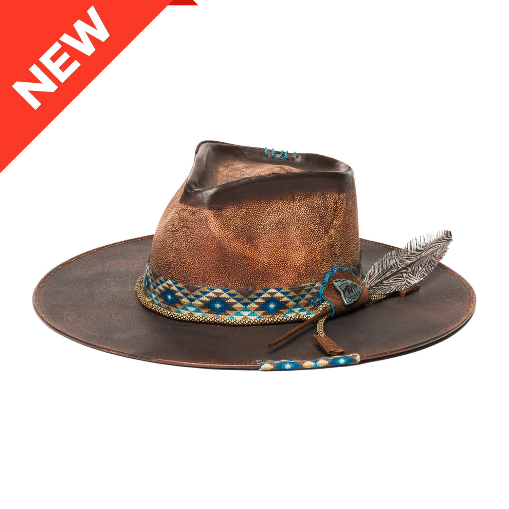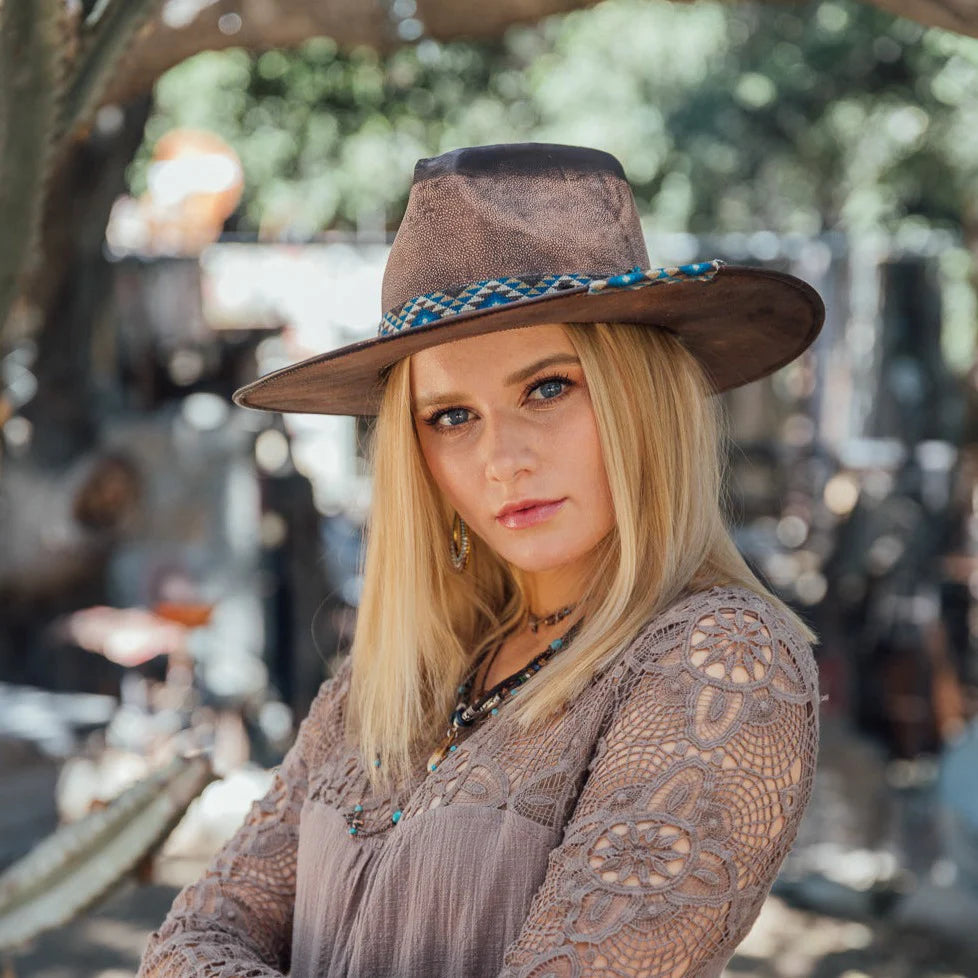 Expertly crafted from genuine leather, the IVY hat boasts a stylish brown design with striking blue accents. The 3 1/2 inch brim provides ample protection from the sun, making this hat both fashionable and practical. Elevate your wardrobe with this high-quality hat.