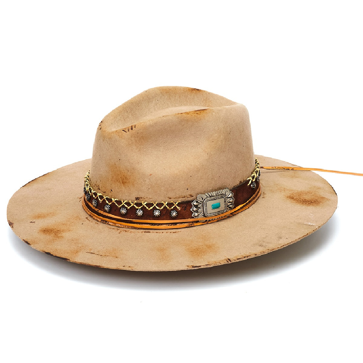 The JANET is an ultra-fashionable flat-brim hat from the Stampede Collection. Crafted with genuine leather, wool felt and adorned with turquoise jewel accents for a touch of classic western charm, this exquisite design effortlessly blends style and comfort. The unique studded and cross-stitched band adds a distinctive detail to make this hat truly stand out.