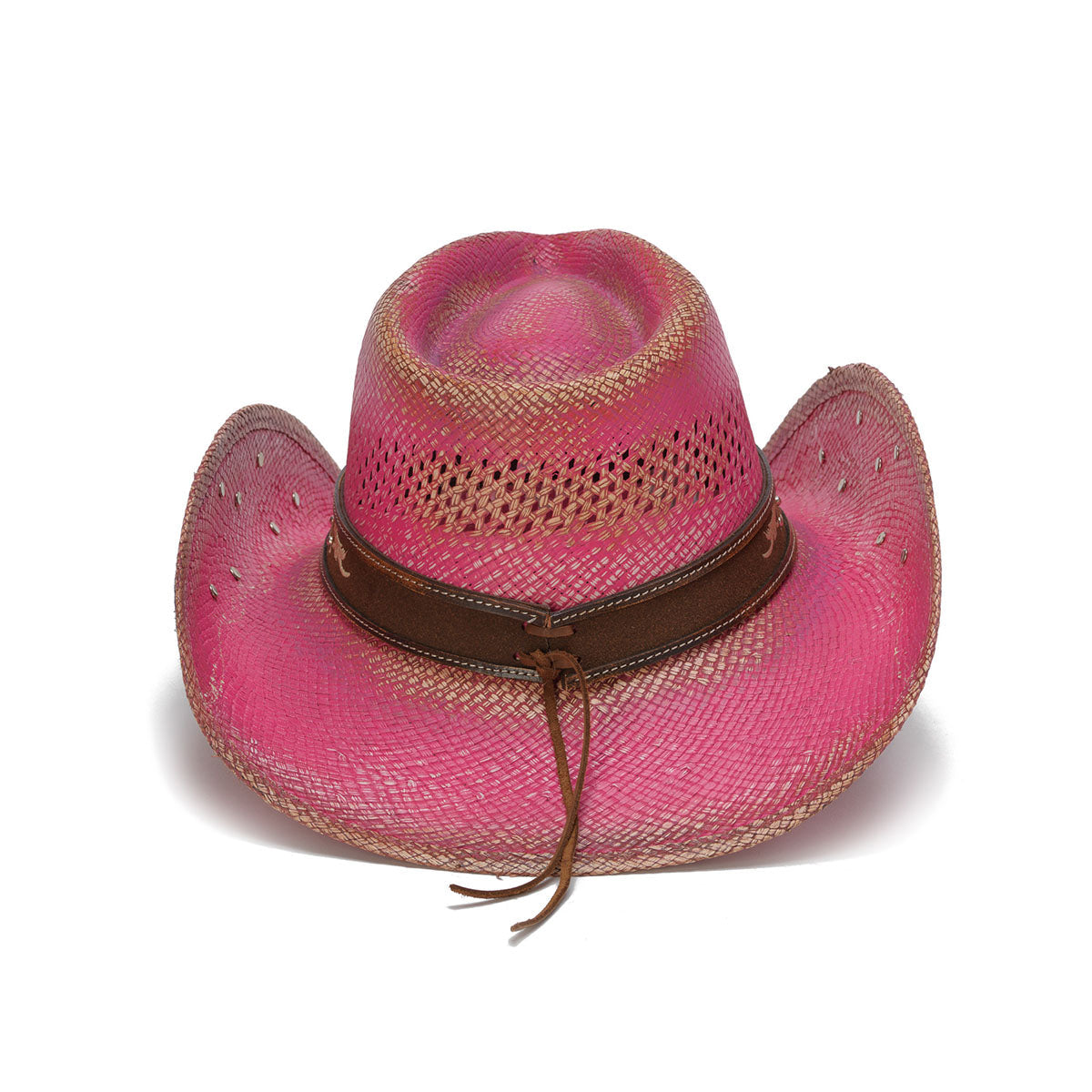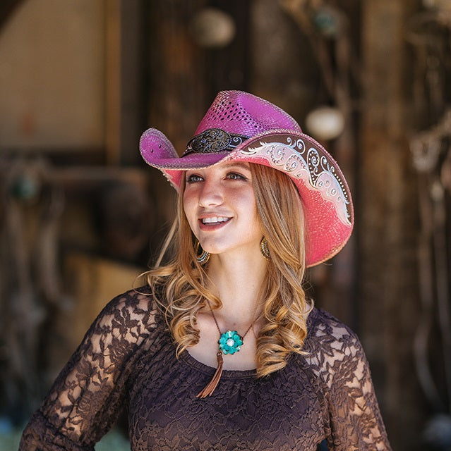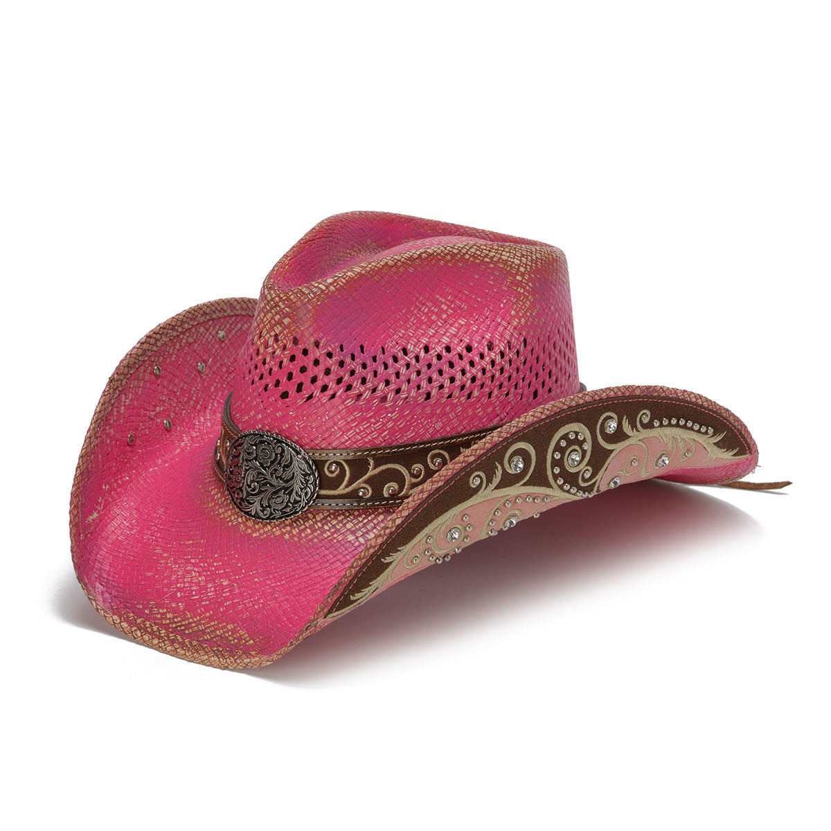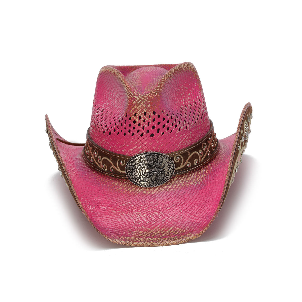 The JENNIE from the Stampede Collection is an effortlessly stylish and durable hat ideal for any occasion. It features genuine Panama straw, a large floral buckle and brown genuine leather with floral designs and studs. Its flared brim is decorated with a floral design and studs embroidered under the curved brim, and the hat has a 4-inch brim.