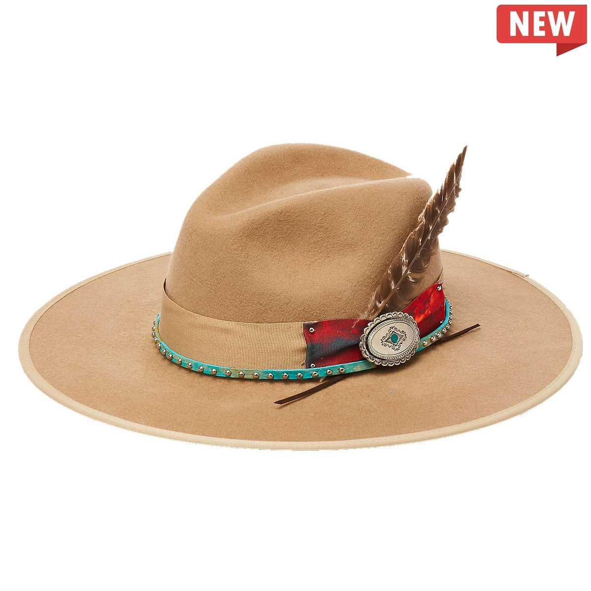 The JOSEPHINE is part of the Stampede Collection, featuring a wool felt construction with a genuine turquoise leather band and mini stud accents. A polyester red ribbon with a feather insert and a turquoise jewel buckle complete the design and a suede chord provides the perfect finishing touch. Offering a 3.5 inch flat brim, this hat is a stylish and timeless addition to your wardrobe.
