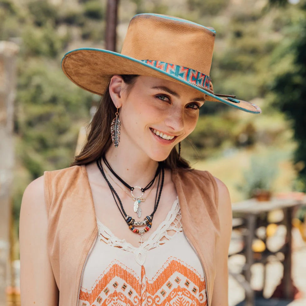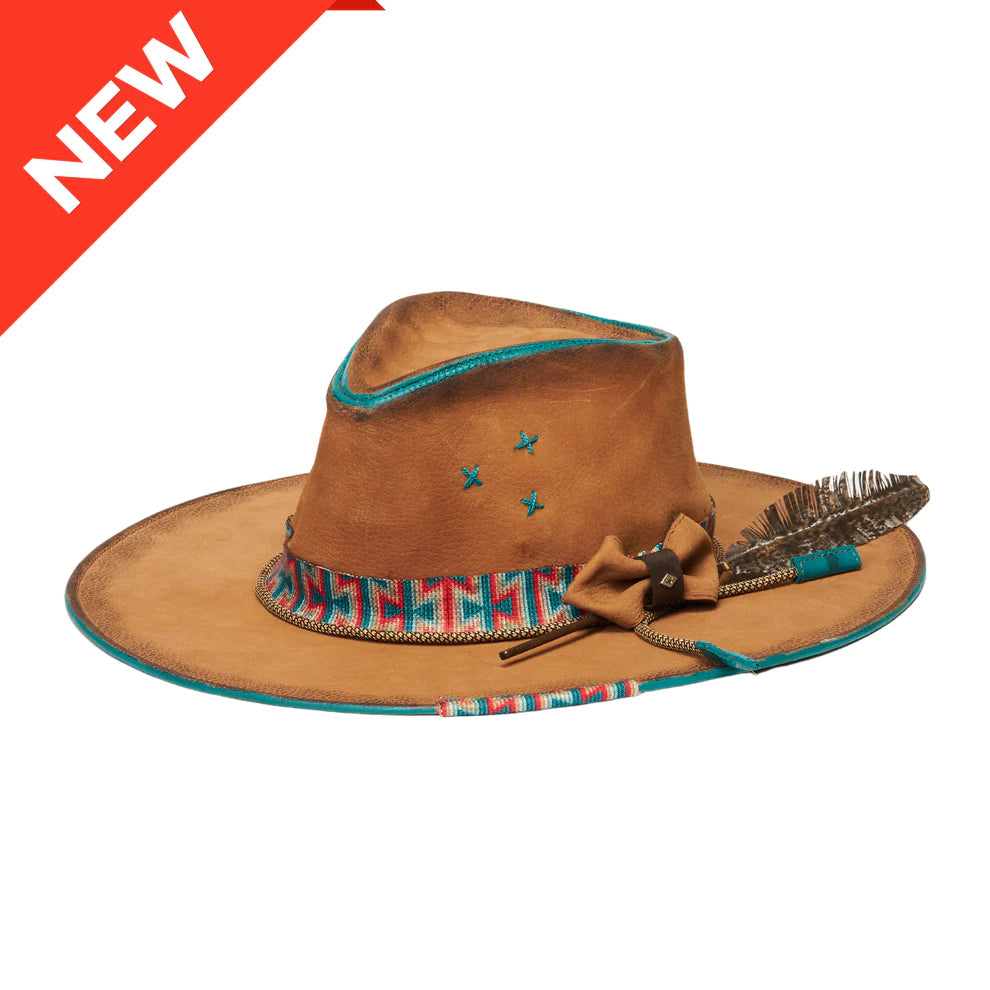 JOSIE Genuine Leather Hat combines high-quality materials with a stylish design. The beige color is accented with red and blue, making it a versatile HAT. With a brim of 3 1/2 inches, it provides ample protection from the sun. Expertly crafted and made from genuine leather, this hat is a perfect addition to any outfit.