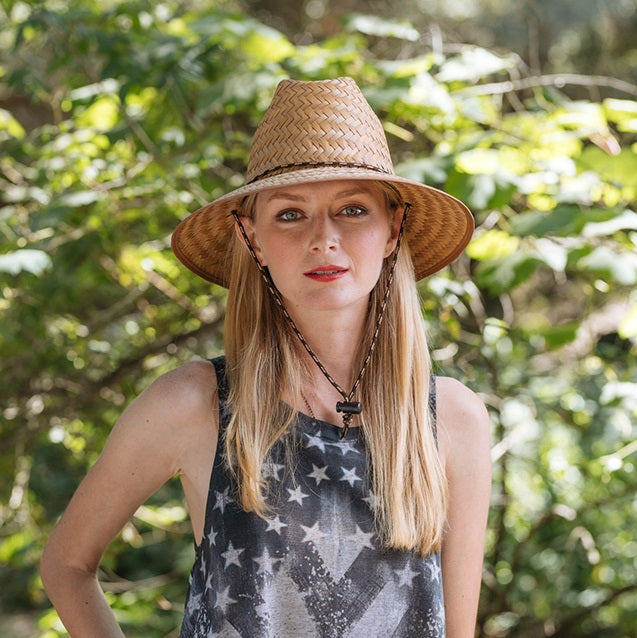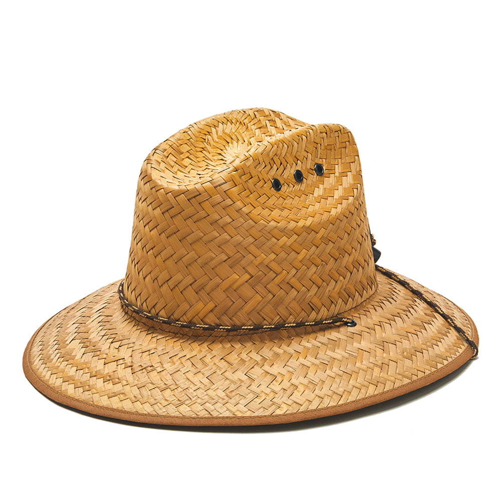 Designed with your summer days in mind, the JUNIOR classic straw hat offers superior U.V. protection and an adjustable chin cord for secure fit. Crafted with a four inch brim, vented crown and elastic fit, you won't have to worry about losing your hat in the waves. Plus, the natural palm leaf material ensures you get a timeless look from the Lifeguard Collection.