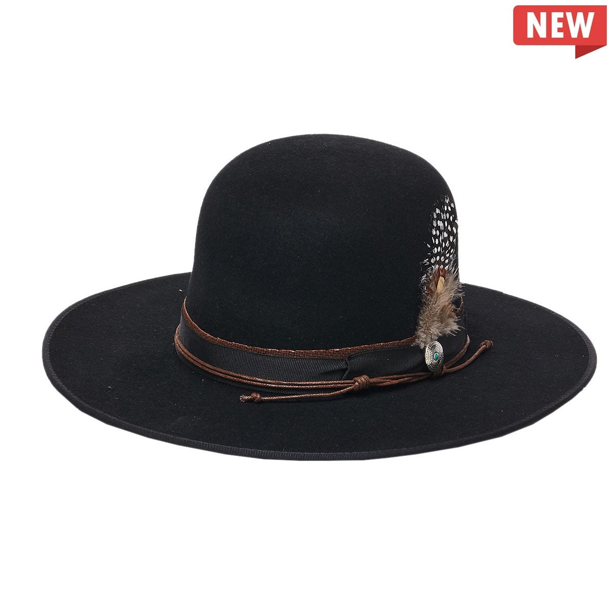 MATTY from the Stampede Collection is the perfect hats for your outdoor adventures. Made with a wool felt material, a polyester ribbon with feather insert, a turquoise jewel buckle, and a suede chord, this hat gives you a secure, premium fit. The 3 inch flat brim will keep the sun off your face.