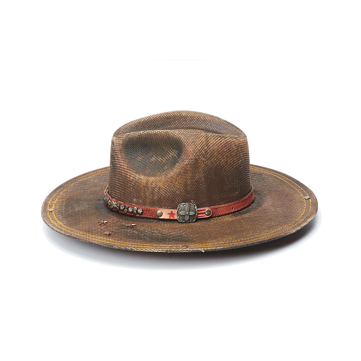 The MAYA flat brim hat is perfect for any stylish look. Crafted from premium canvas with a fashionable brown genuine leather band, this statement piece features an embroidered pattern of studs and a stylish cross stitch design. It's finished with a small cross buckle and part of the prestigious Stampede Collection.
