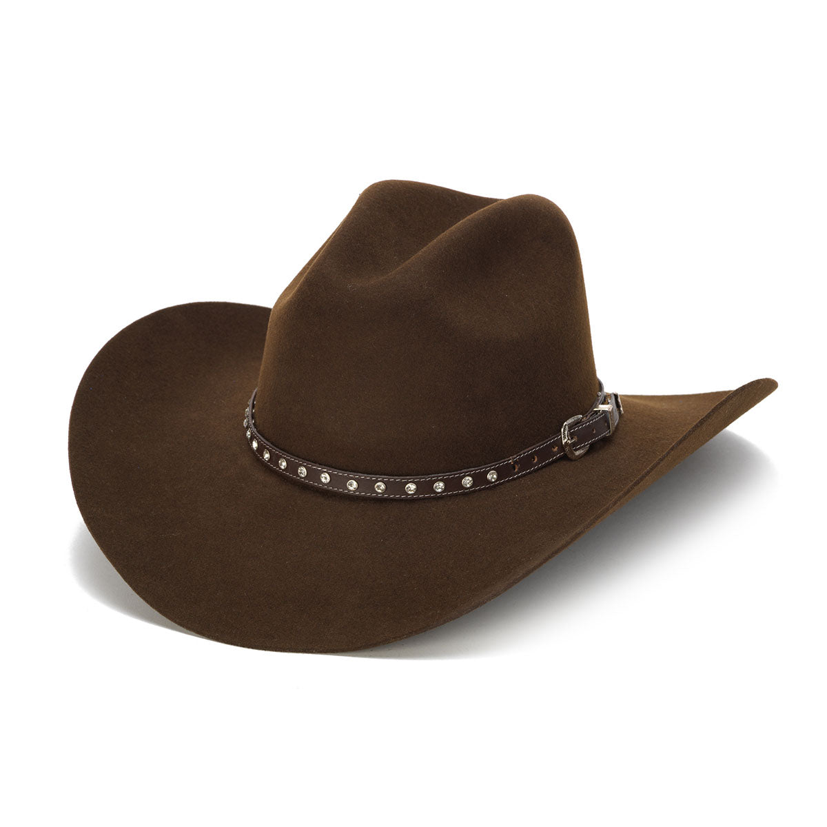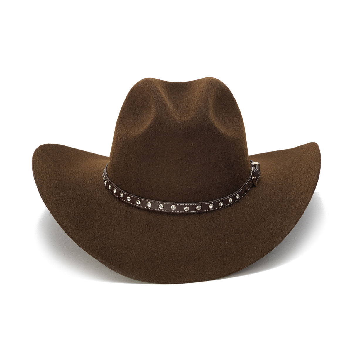 The MAYBELLE Stampede Collection brings classic style and elegance to the wild, western lifestyle. Crafted from genuine leather, this hat is detailed with mini studs and a metal strap for added flare. For comfort and durability, the hat is lined with wool felt, a 4 inch brim providing the perfect amount of sun protection and style.