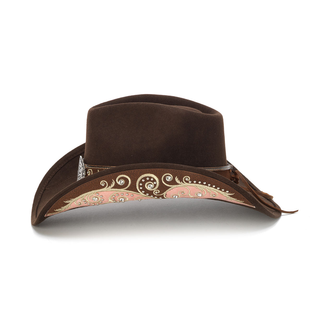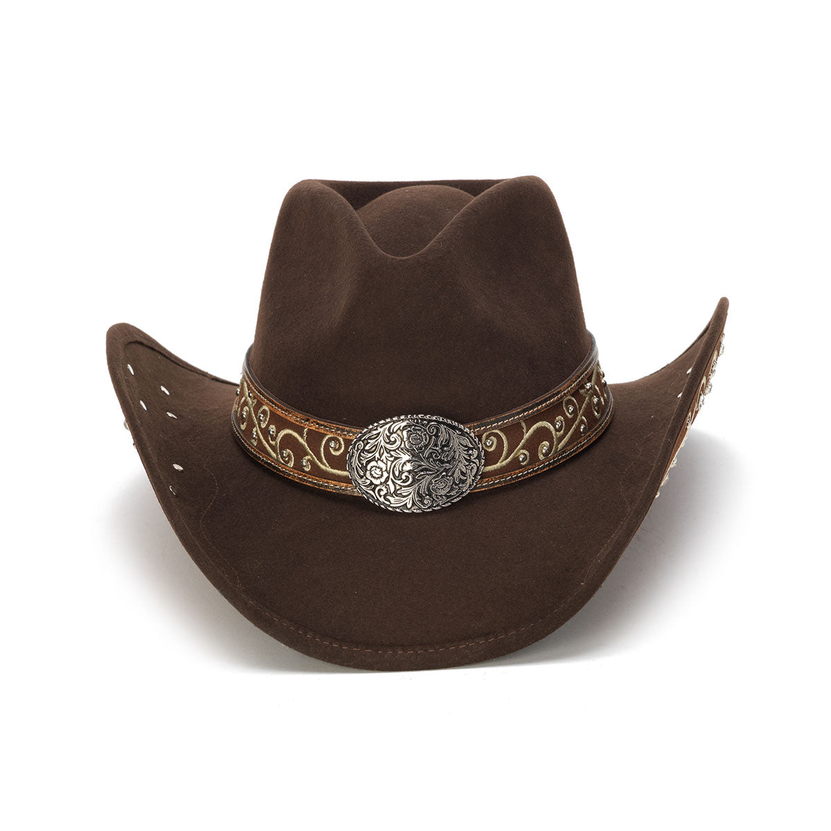 The MOLLY hat is designed with the utmost craftsmanship. Featuring a classic wool felt material and genuine leather band, the MOLLY is from the Stampede Collection. A floral design is featured on the band and buckle, with studs under the curved brim for extra detail. The hat boasts a 4-inch brim for protection from the sun.
