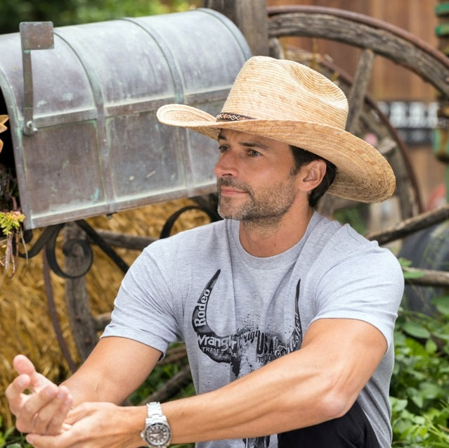The MX-950 hat from the Saddleback Collection is a showstopper. Crafted from genuine leather with palm leaf, the 4 inch brim and cross stitching provide a timeless combination of style and durability. Perfect for outdoor adventures, this hat is sure to keep you looking sharp.
