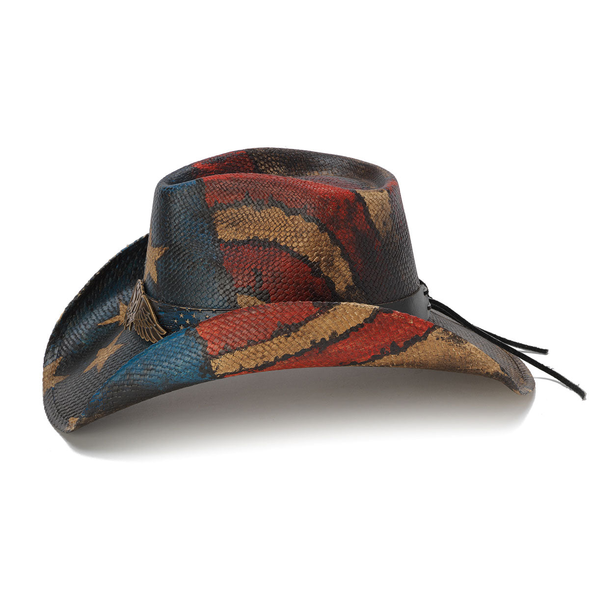 The PATRIOT is part of the Stampede Collection and is sure to make a statement. It features a genuine Panama Straw and a USA buckle with a star and wings. The custom USA flag is printed on genuine leather and the 4” brim is hand-painted with a USA flag. This one-of-a-kind piece makes a bold statement of patriotism.
