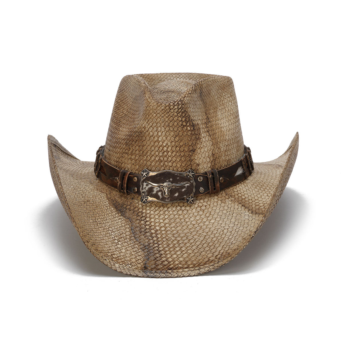 The PEYTON is a classic hat from the Stampede Collection. It features a genuine Panama straw longhorn buckle with 100% natural cow skin fur, and a genuine brown leather band with studs. It also has a 4-inch brim and is crafted with the utmost attention to detail for a timeless, memorable look.