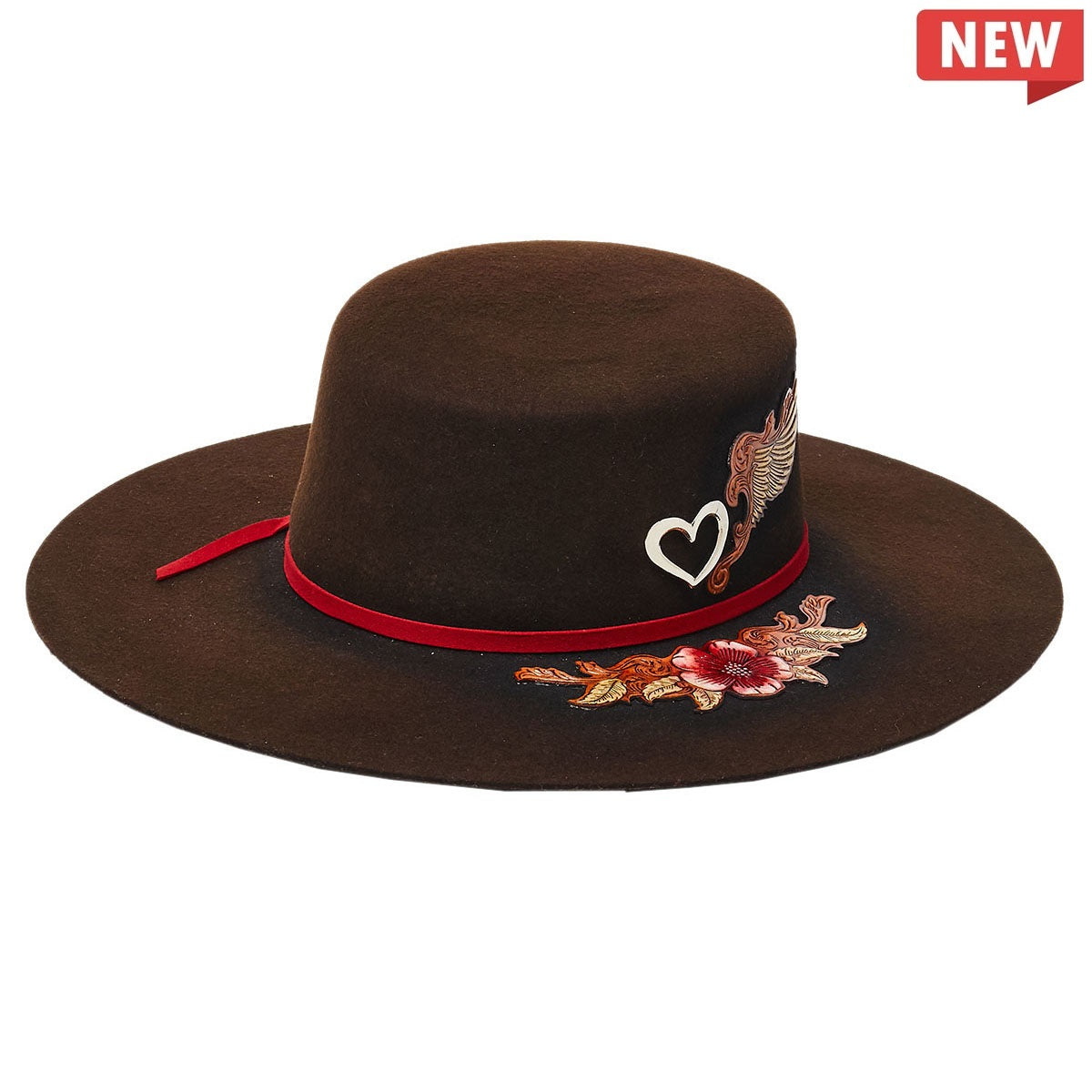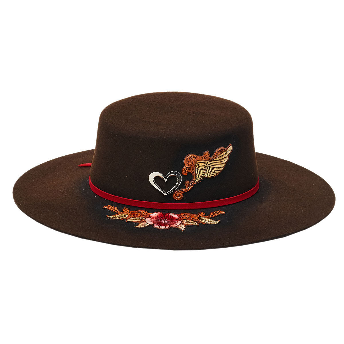 The PHILADELPHIA is part of Stampede's distinct collection. Constructed from luxuriously soft wool felt, it features a 4 inch flat brim and is delicately finished off with a red polyester ribbon, heart buckle, and intricate wing and flower embroidery.