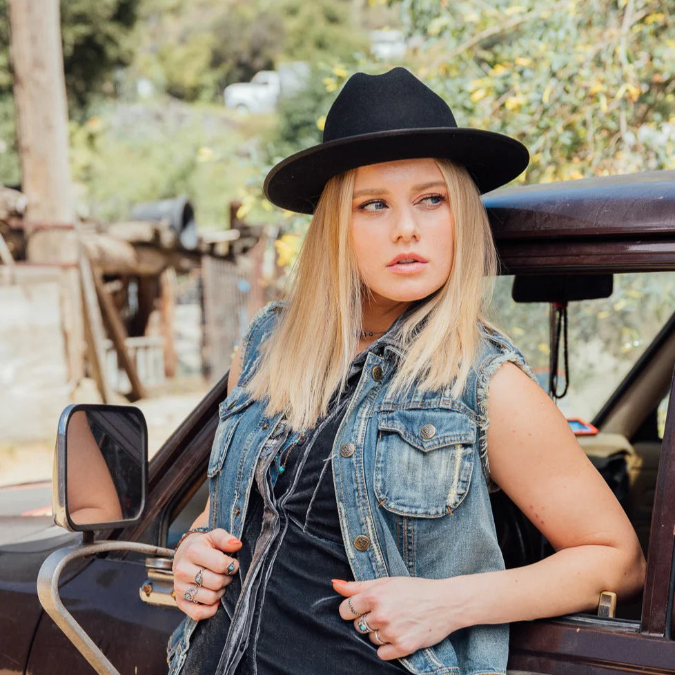 Introducing RILEY, the ultimate accessory for any fashion-forward individual. Made from high-quality WOOL FELT, this sleek BLACK HAT features a stylish 2.75 INCH BRIM, providing both comfort and sophistication. Stay on trend with RILEY's modern and timeless design.
