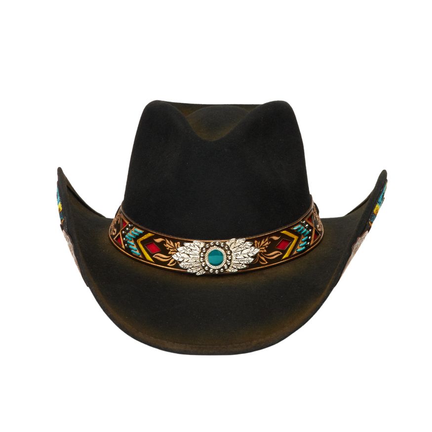 Expertly crafted with 100% wool felt, RYDER boasts a stylish 4 inch brim and a sleek black color. The band features a unique design and is accented with a turquoise silver buckle, adding a touch of sophistication to this premium hat. Perfect for any occasion, RYDER is durable, comfortable, and sure to elevate your style.