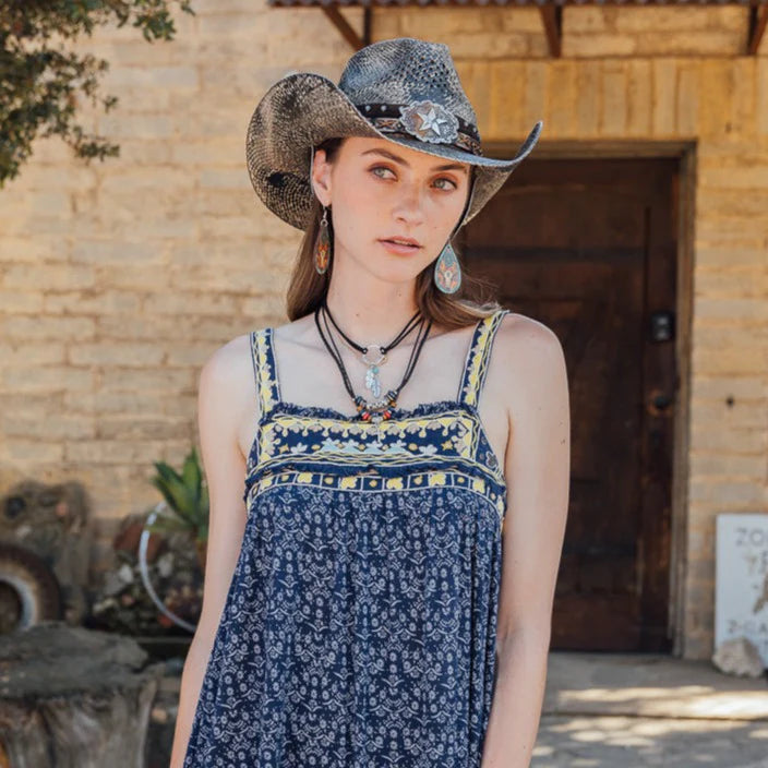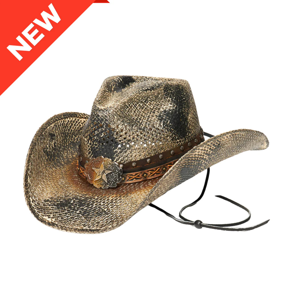 Made of genuine Panama straw, the STELLA hat boasts a 3 2/3 inch brim and sleek black stain with a contrasting brown band. Stay stylish and protected from the sun with this high-quality hat.