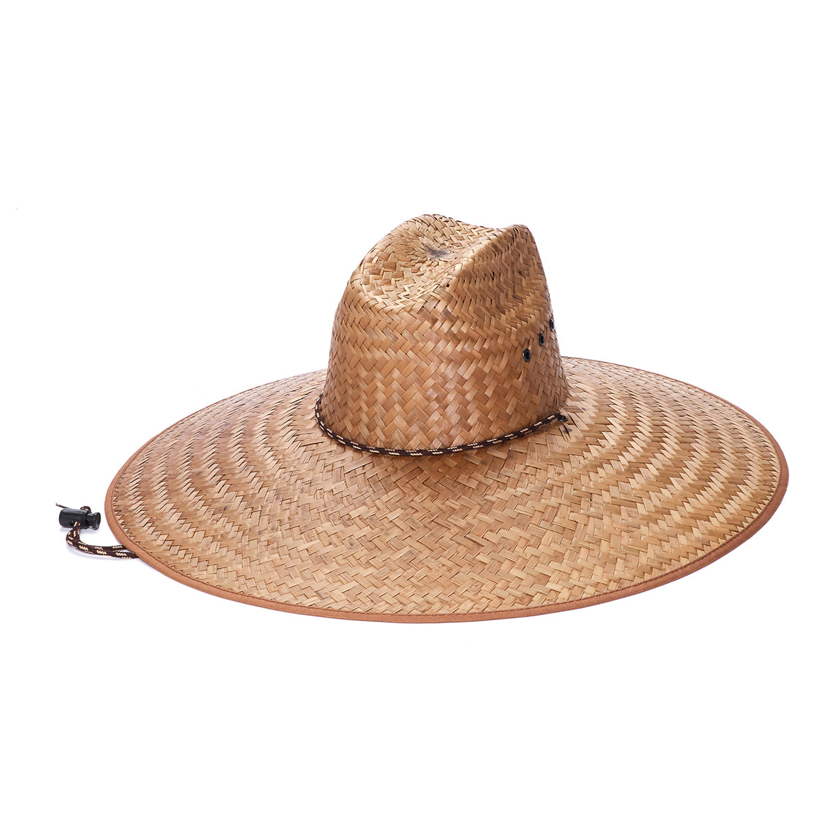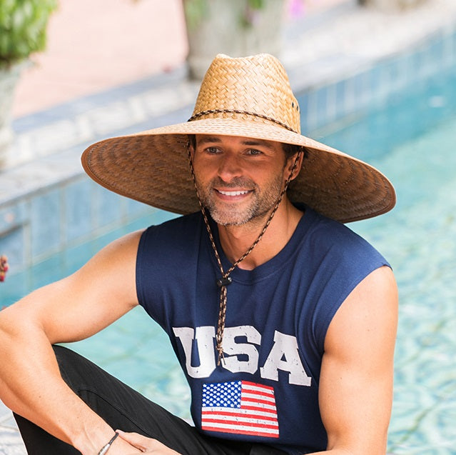 The SUNDANCE lifeguard collection hat keeps your head cool and protected in the sun. Featuring a palm leaf construction with an adjustable chin cord and 6.75 inch brim, it offers excellent U.V. sun protection for those long days. A vented crown and elastic fit ensures maximum breathability and comfort, all wrapped up in a classic straw hat look.