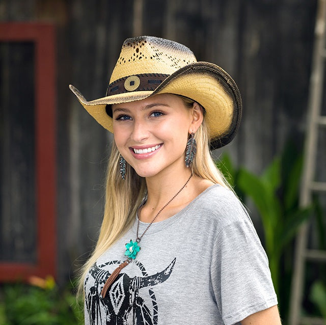 The TX-2260 from the Saddleback collection is a superior hat for any outdoor activity. It is crafted from genuine Toyo straw and genuine leather for long-lasting durability, features a shapeable wired brim and a vented crown, and boasts medallion buckles for an elegant touch. Enjoy stylish protection in any outdoor conditions.