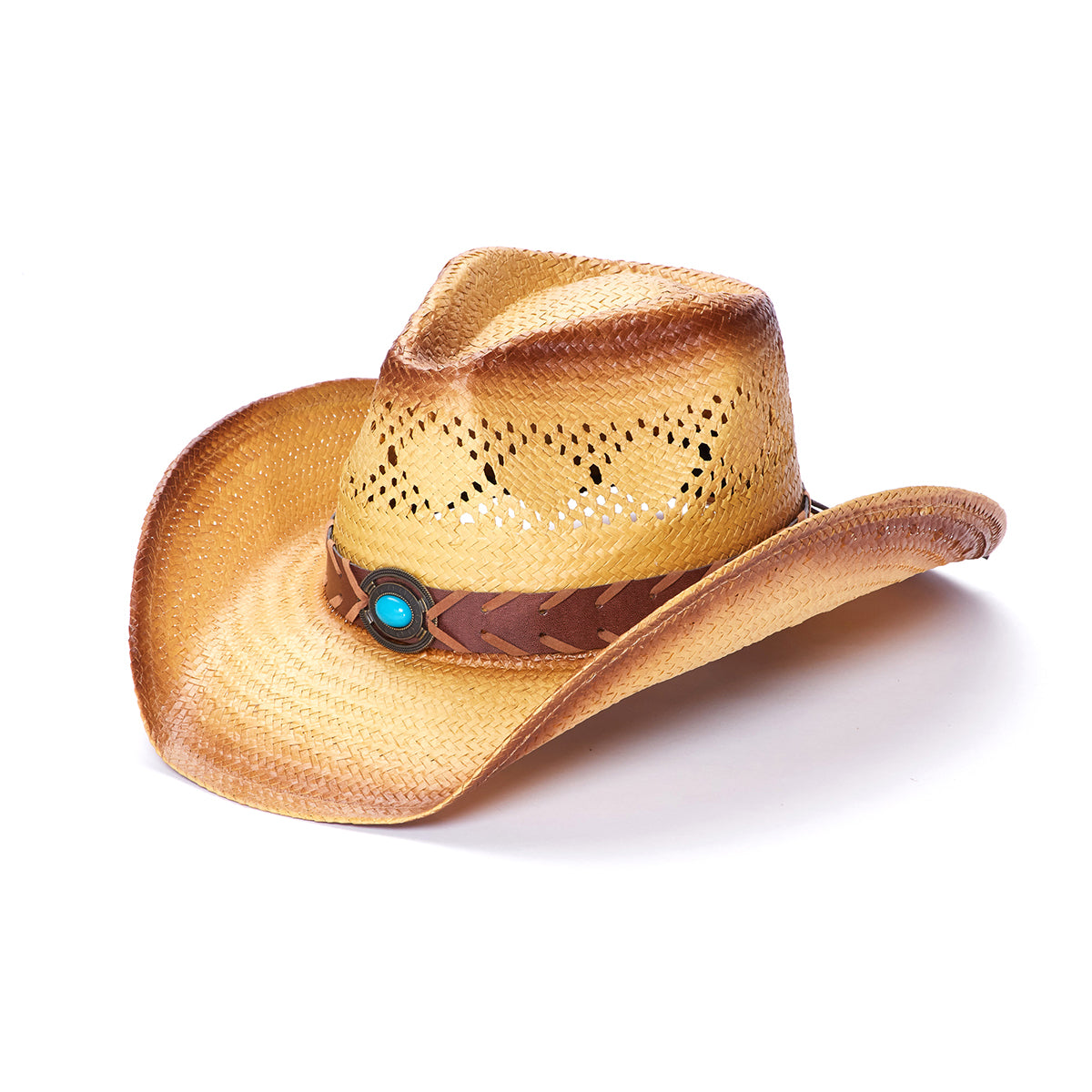 The TX-2270 is a stylish sun hat from the Saddleback Collection. It features a genuine Toyo straw crown and genuine leather band with stitching for long-lasting durability. The large turquoise jewel buckle and shapeable wired brim complete the look. The brim measures 3.5 inches and is vented for breathability and comfort.