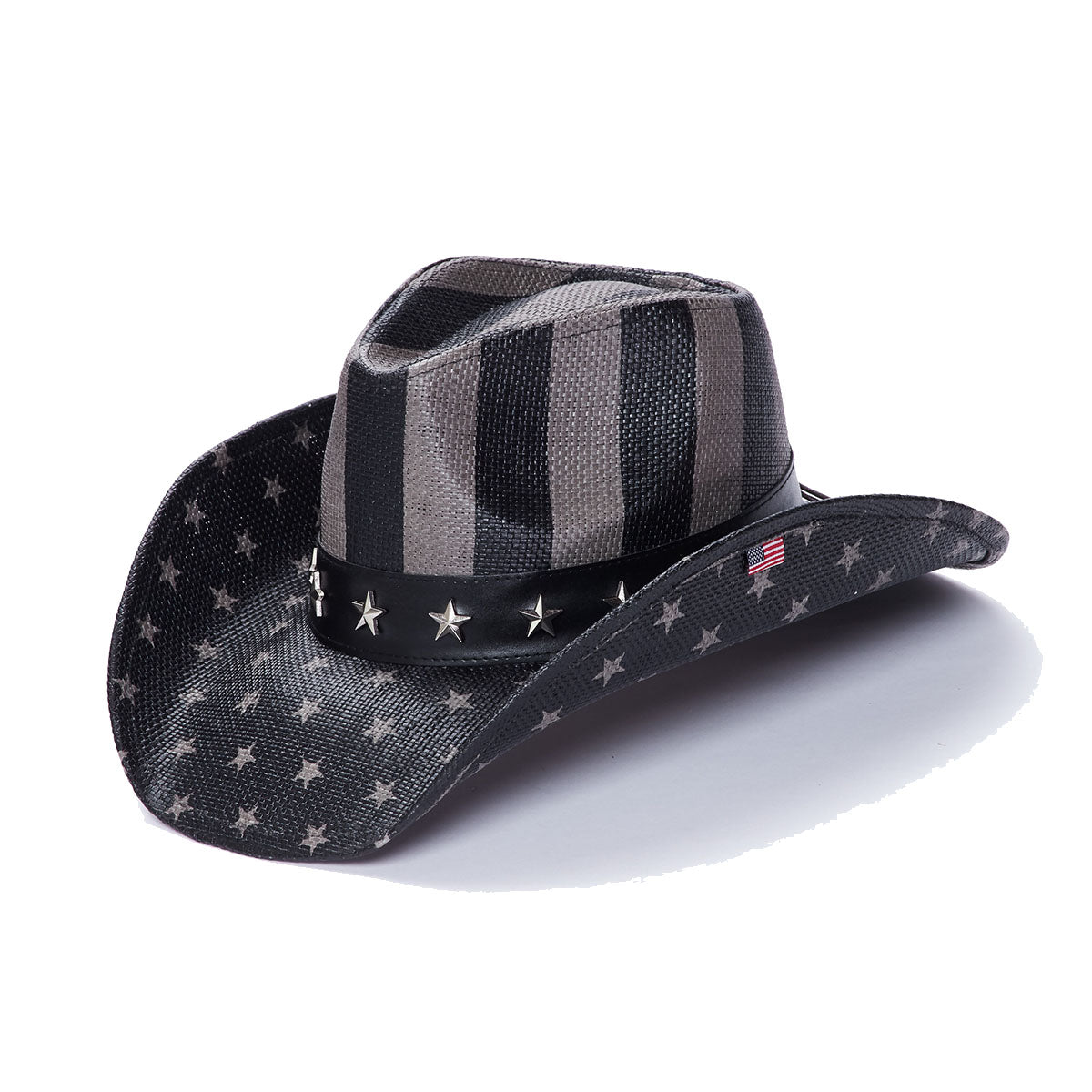 The TX-722 hat from the Saddleback Collection is crafted with genuine Toyo Straw and genuine leather band, featuring star pins for a classic western look. The black and white American flag design, shapeable wired brim, and 3.5 inch brim make this hat the perfect accessory for a stylish and patriotic look.